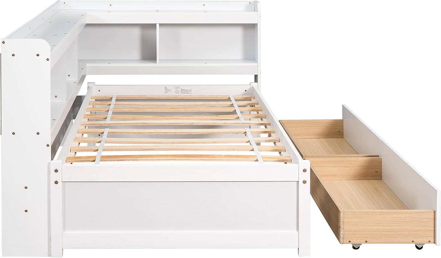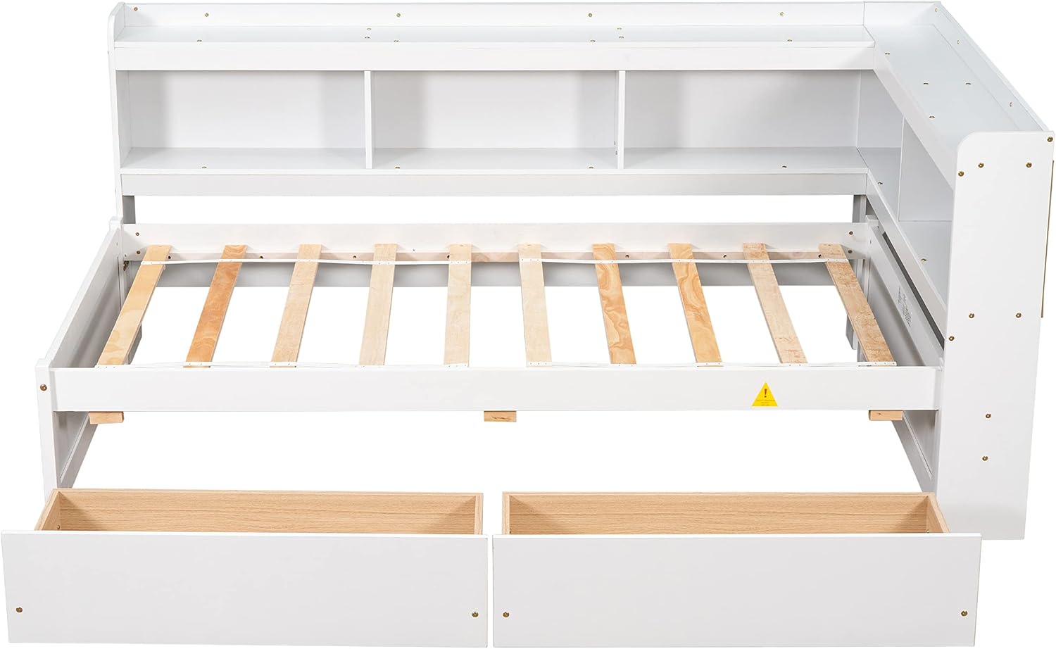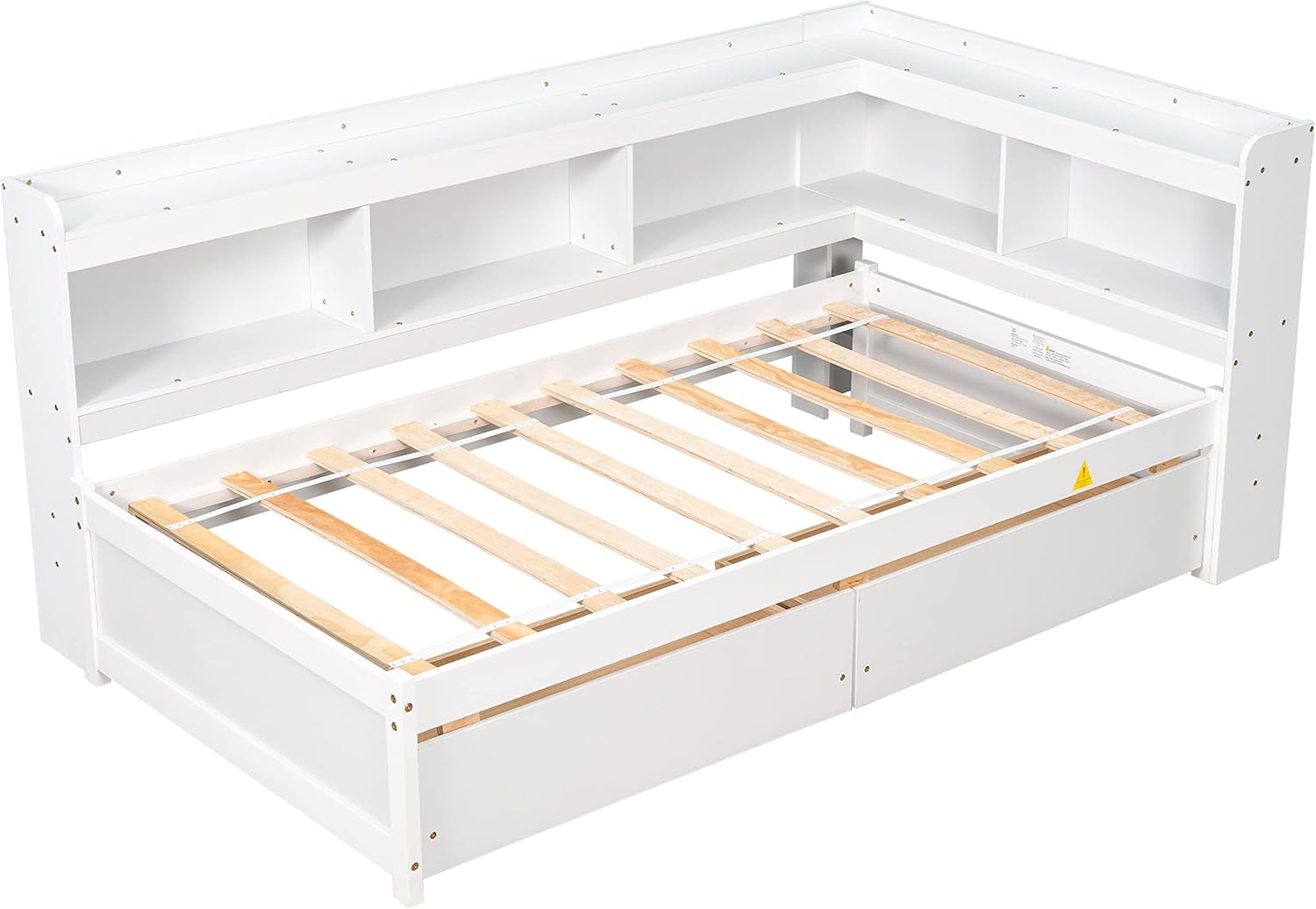 Twin Size L-Shaped Corner Daybed with Bookcase Headboard, Wooden Storage Platform Bed with 2 Drawers for Kids Adults, No Box Spring Needed, Bedroom/Living Room Furniture, White