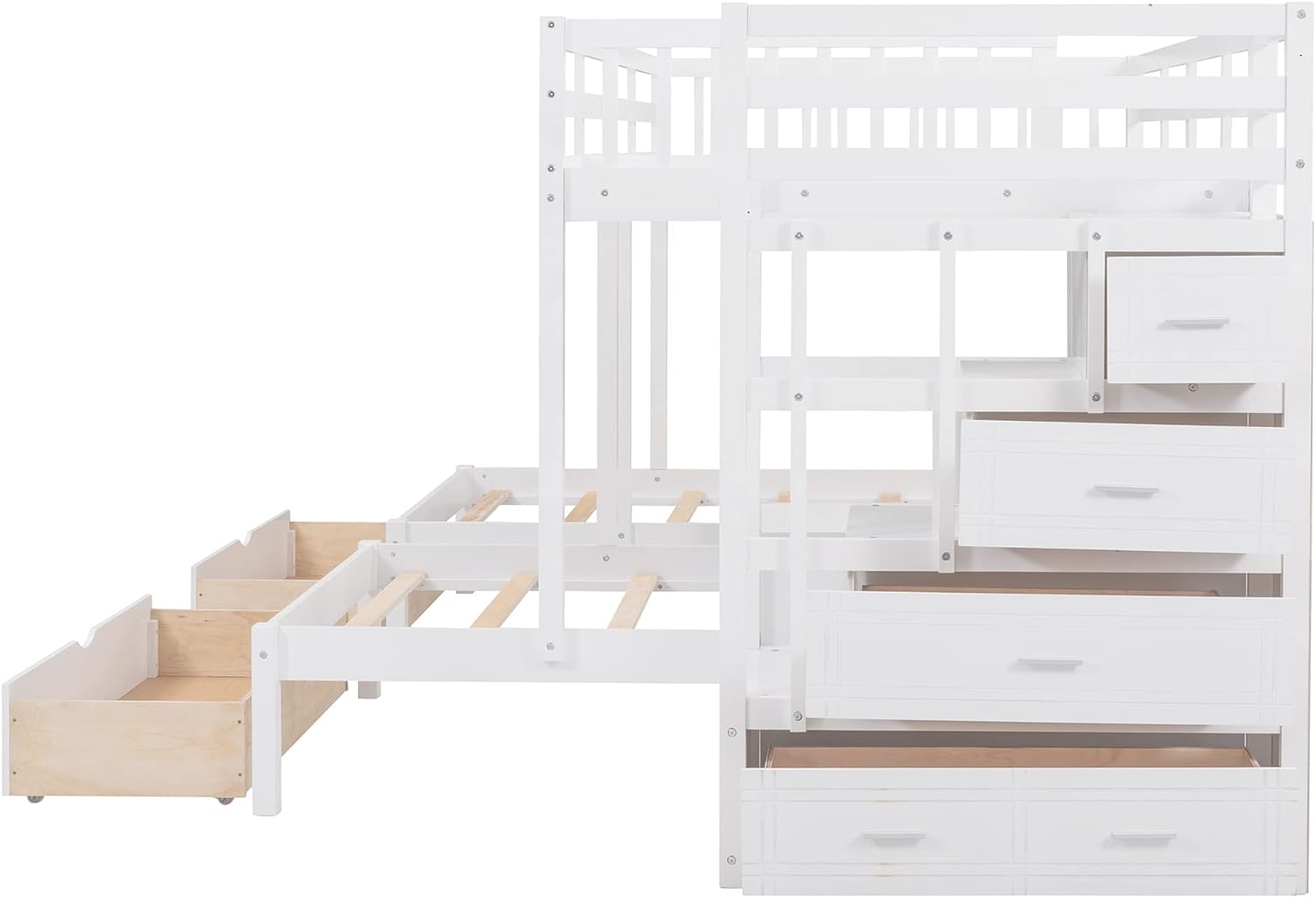 SOFTSEA L-Shaped Triple Bunk Beds with Staircase Corner Bunk Bed with 2 Storage Drawers, Full Over Twin & Twin Bunk Beds for Kids, Triple Bunk Beds with Stairs and Drawers