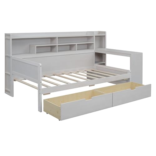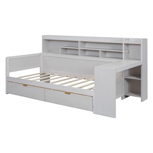 Twin Size Daybed with Storage Drawers and Shelves, Pine Wood Corner Bed Frame with Bookshelf and Upholstered Headboard for Kids Boys Girls, White
