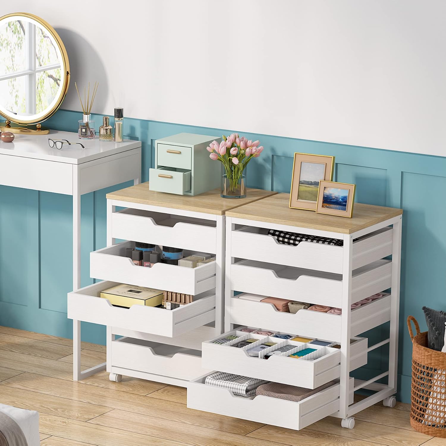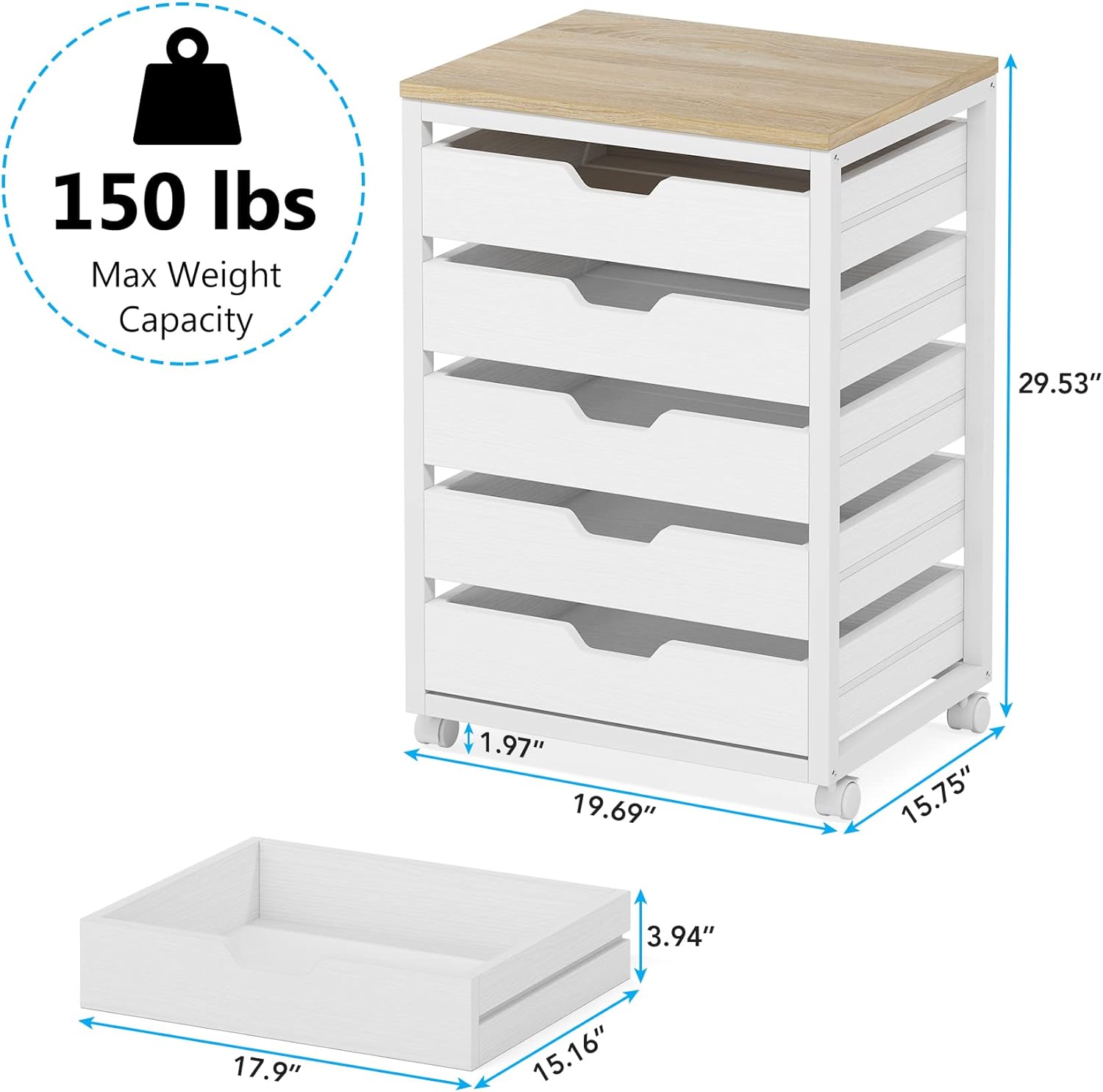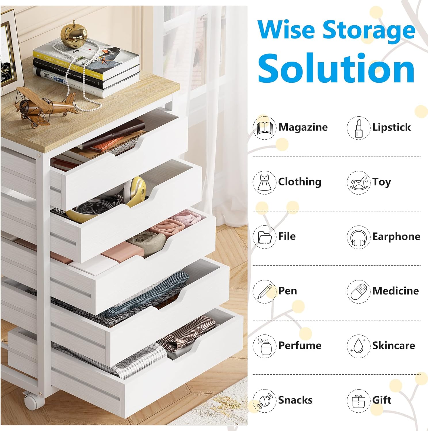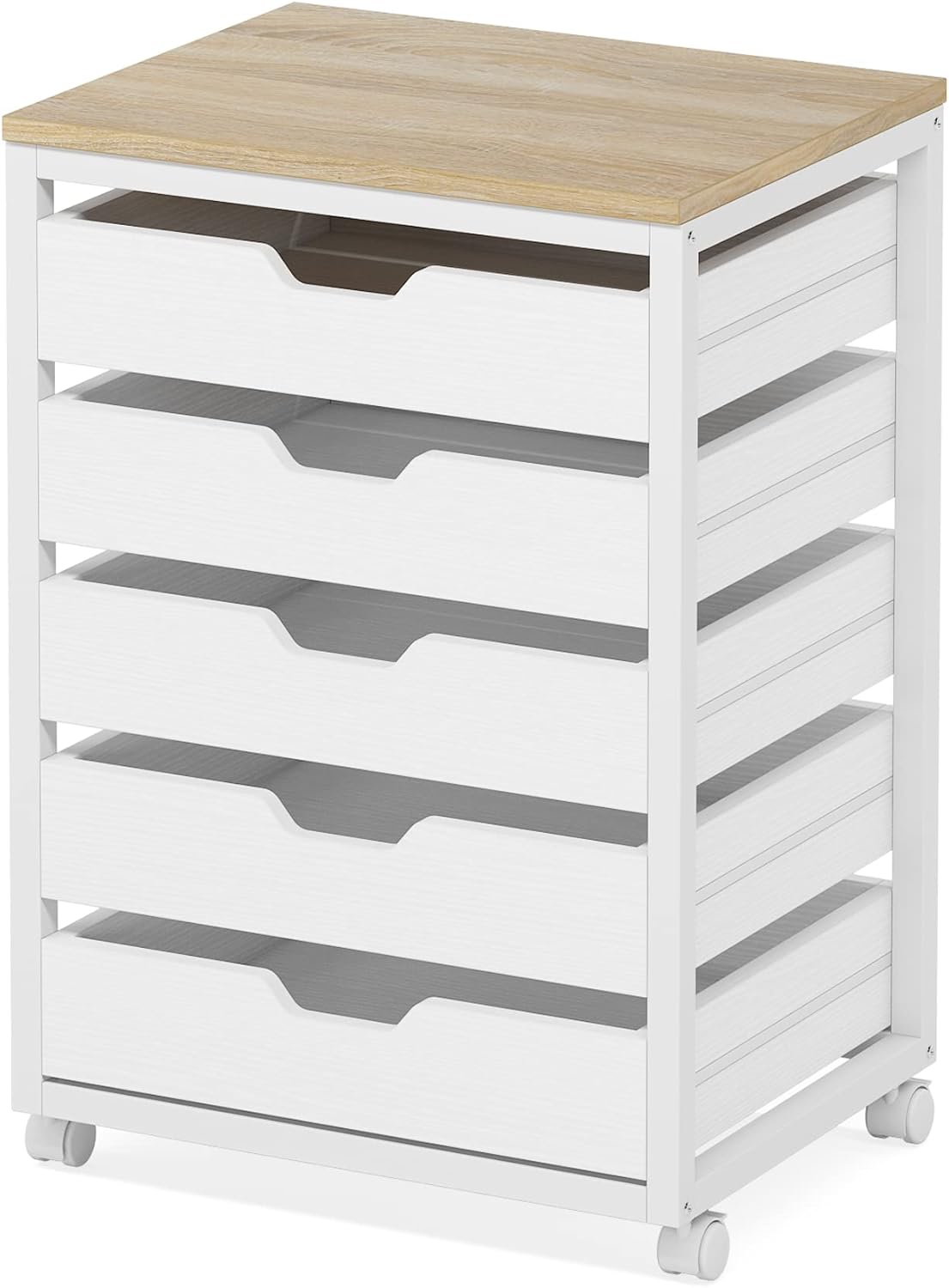 5 Drawer Chest, Wood Storage Dresser Cabinet with Wheels, Storage Chest of Drawers for Office Bedroom Entryway, White
