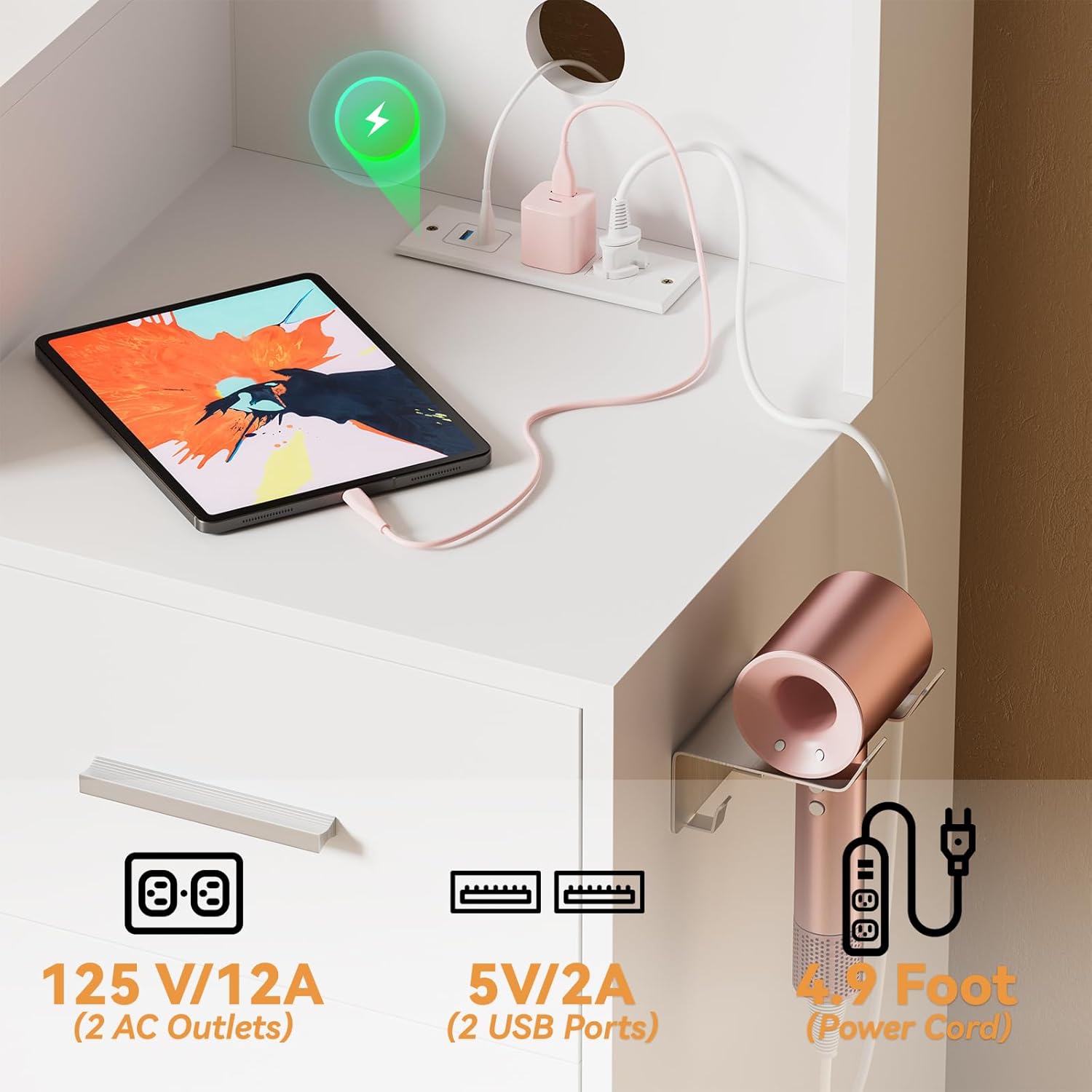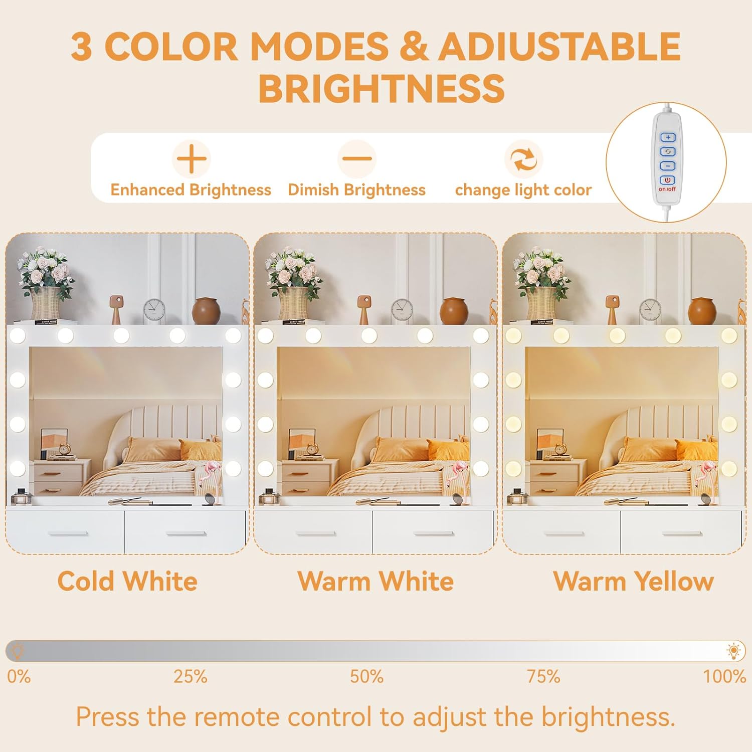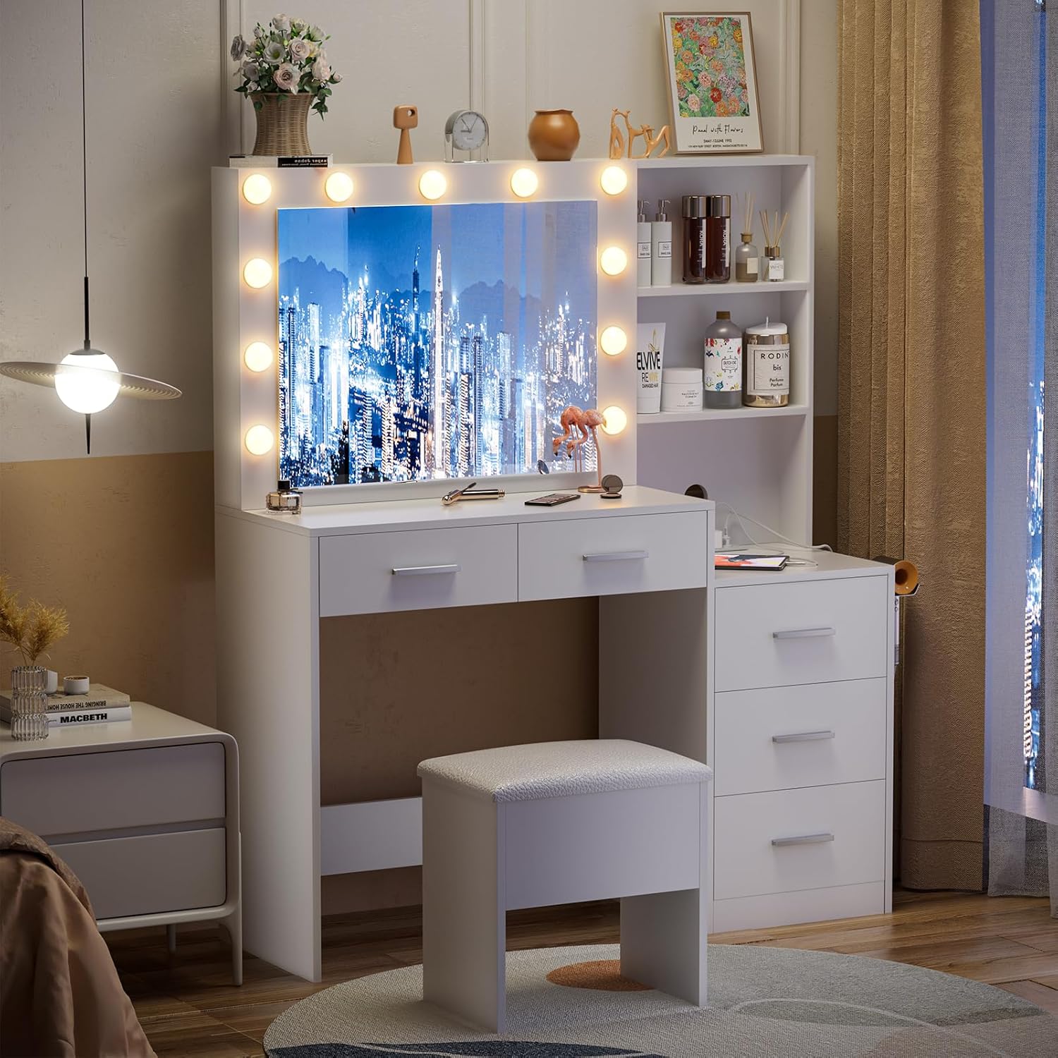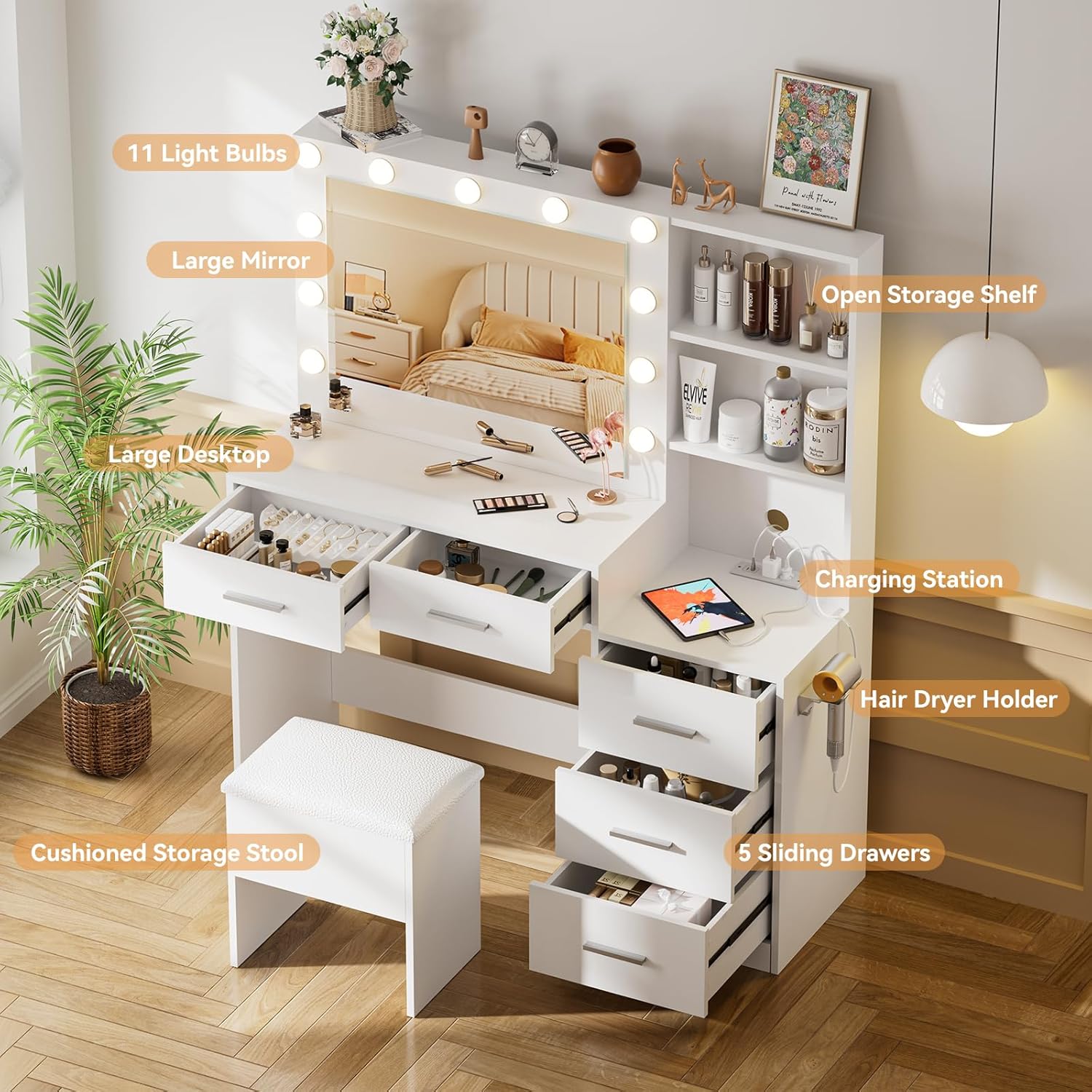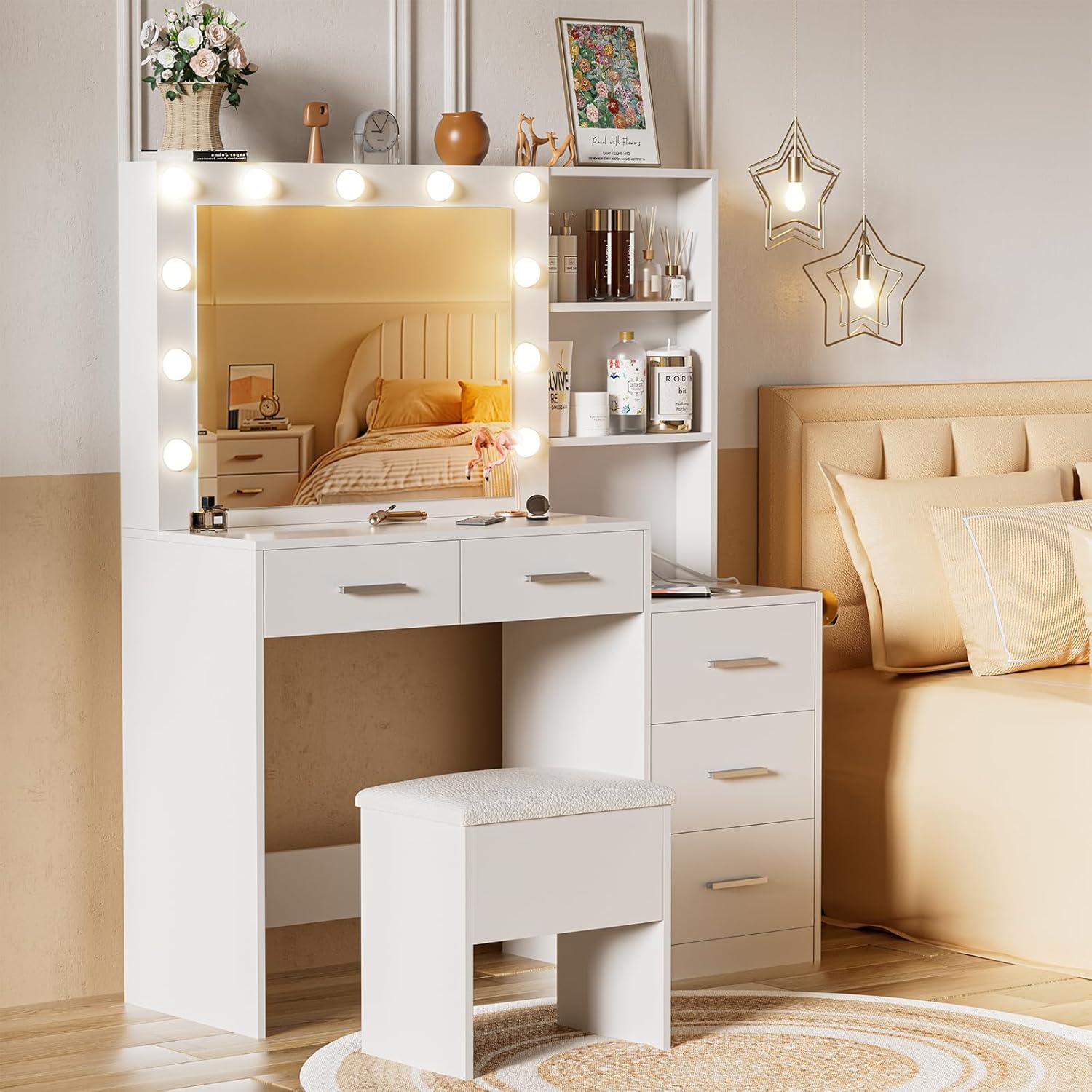 Makeup Vanity Desk with Mirror and Lights,Power Outlet, Makeup Table with Drawers & Open Storage Shelves,Storage Stool,Dressing Vanity Tables for Women Girls, Bedroom, White