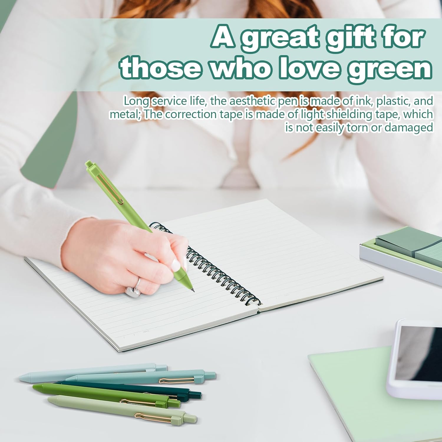 16 Pcs Green School Supplies Cute Large Pencil Case 6 Retractable Black Ink Gel Pens 2 Ruled Spiral Notebook 6 Correction Tape 480 Sheets Sticky Notes Aesthetic Stationery Set for Study Office
