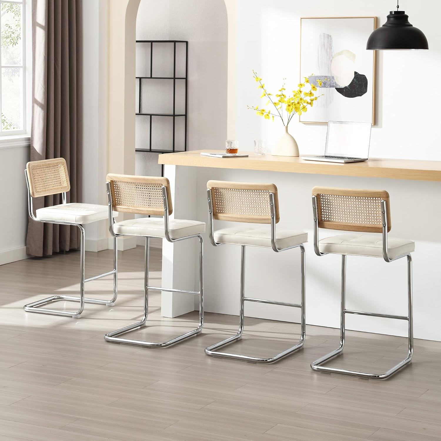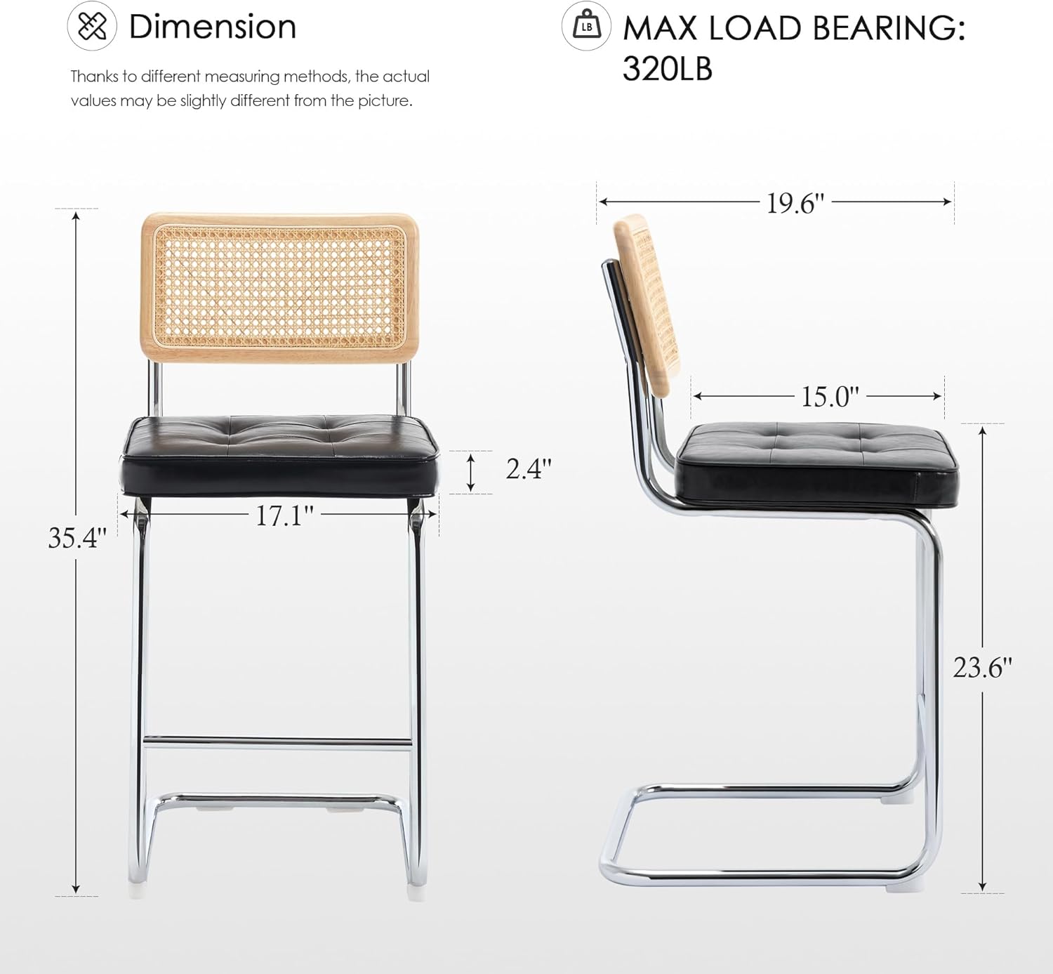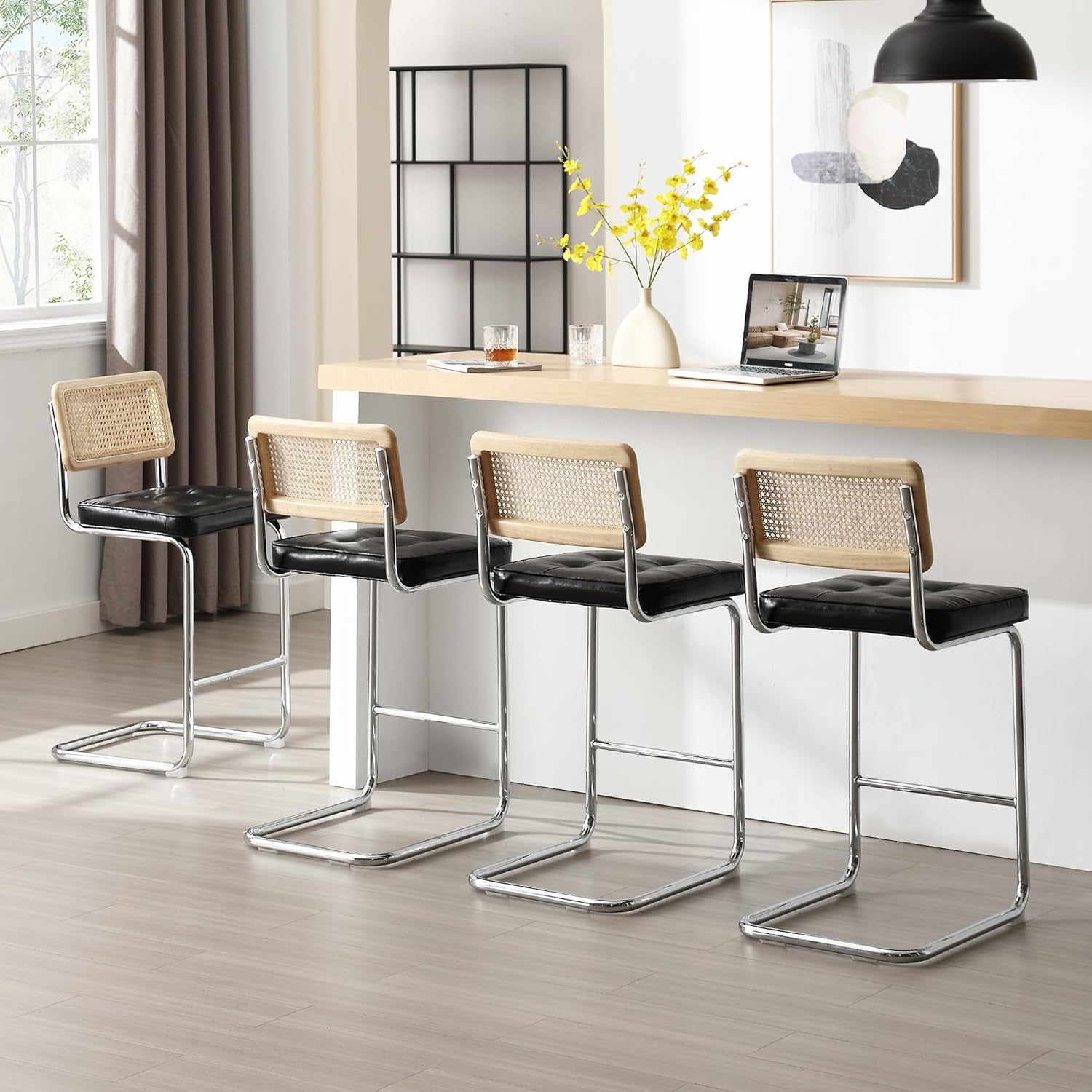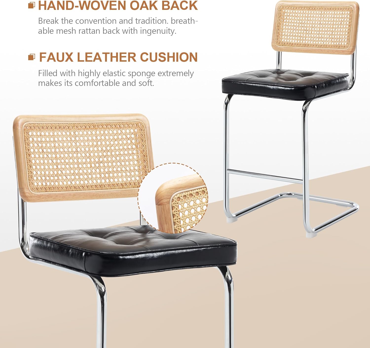Zesthouse Modern Counter Height Stools, 24'' Natural Rattan Counter Stools Set of 2, Faux Leather Kitchen Stools with Backs, Mid Century Cantilevered Design Counter Chairs Island Stools, Black