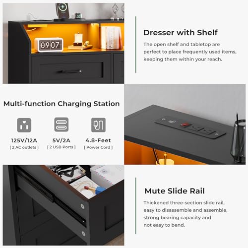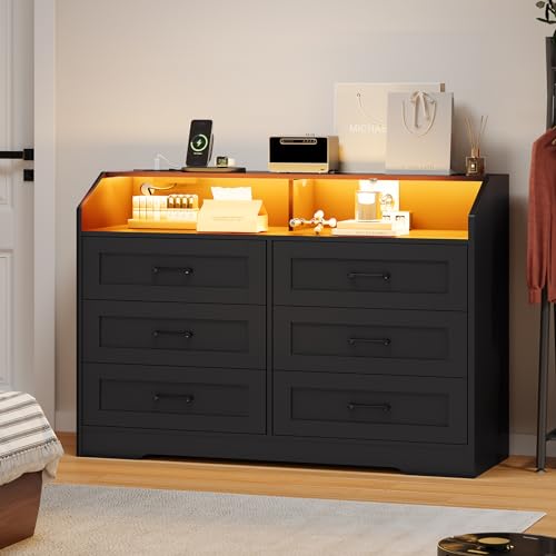 DICTAC LED Dresser for Bedroom, 6 Drawer Dresser with Charging Station, Chest of Drawers with Storage Cubby, Storage Organizer Unit for Bedroom, Closet, Living Room, White