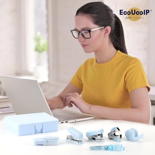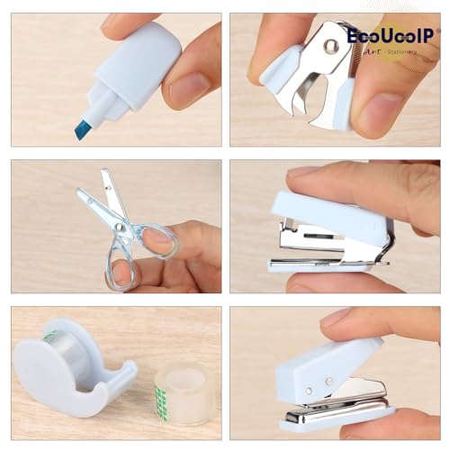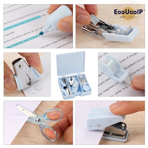 EooUooIP Practical and Beautiful Office Supplies Blue Handbook Tool Box,Stapler Tape Staples Hole Puncher Paper Scissor for Efficient Work and Stylish Gifting. Visit The EooUooIP Store