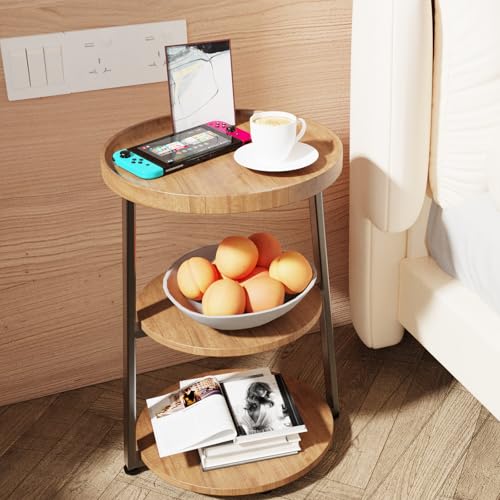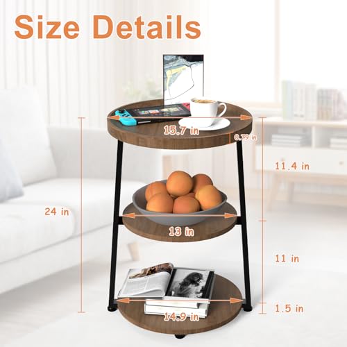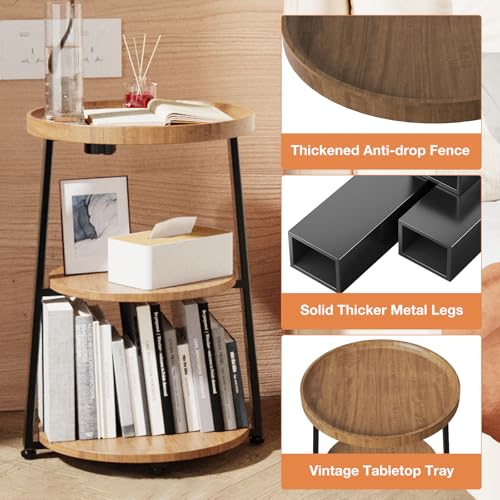 Round End Table with 3-Tier Shelves, Rustic Brown Wood Texture Side Table, Small Desk Coffee Table for Living Room Bedroom