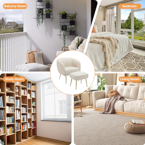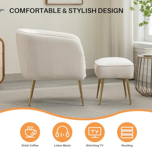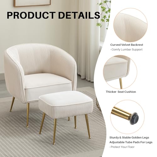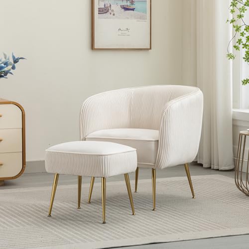 Velvet Accent Chair with Ottoman Set Modern Barrel Arm Upholstered Single Sofa Round Tub Chair with Metal Legs Footrest for Living Room Bedroom Reading Room Office, Orange