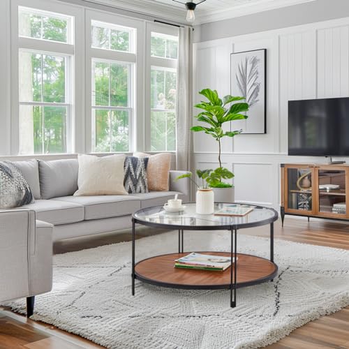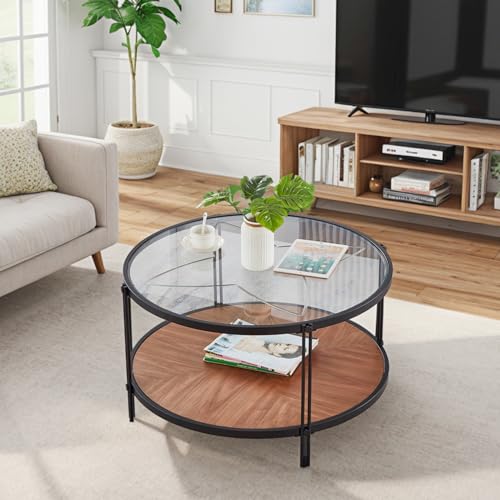 32" Round Glass Coffee Table with Wood Bottom, Circle Coffee Table with Glass Top & Metal Frame, Small Center Coffee Table for Living Room, Apartment (Only Coffee Table, 32" Dx32 Wx18 H, Gold)