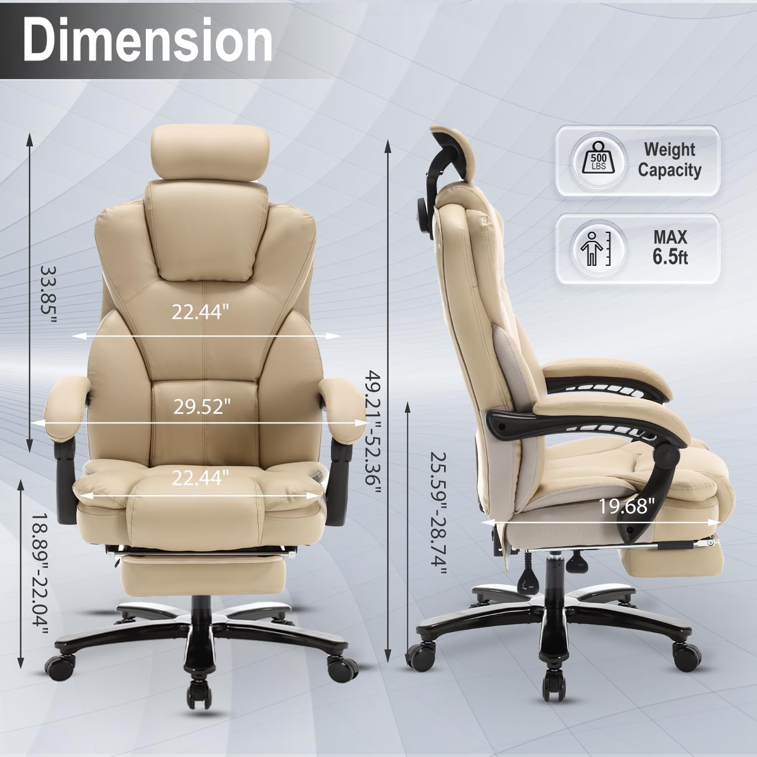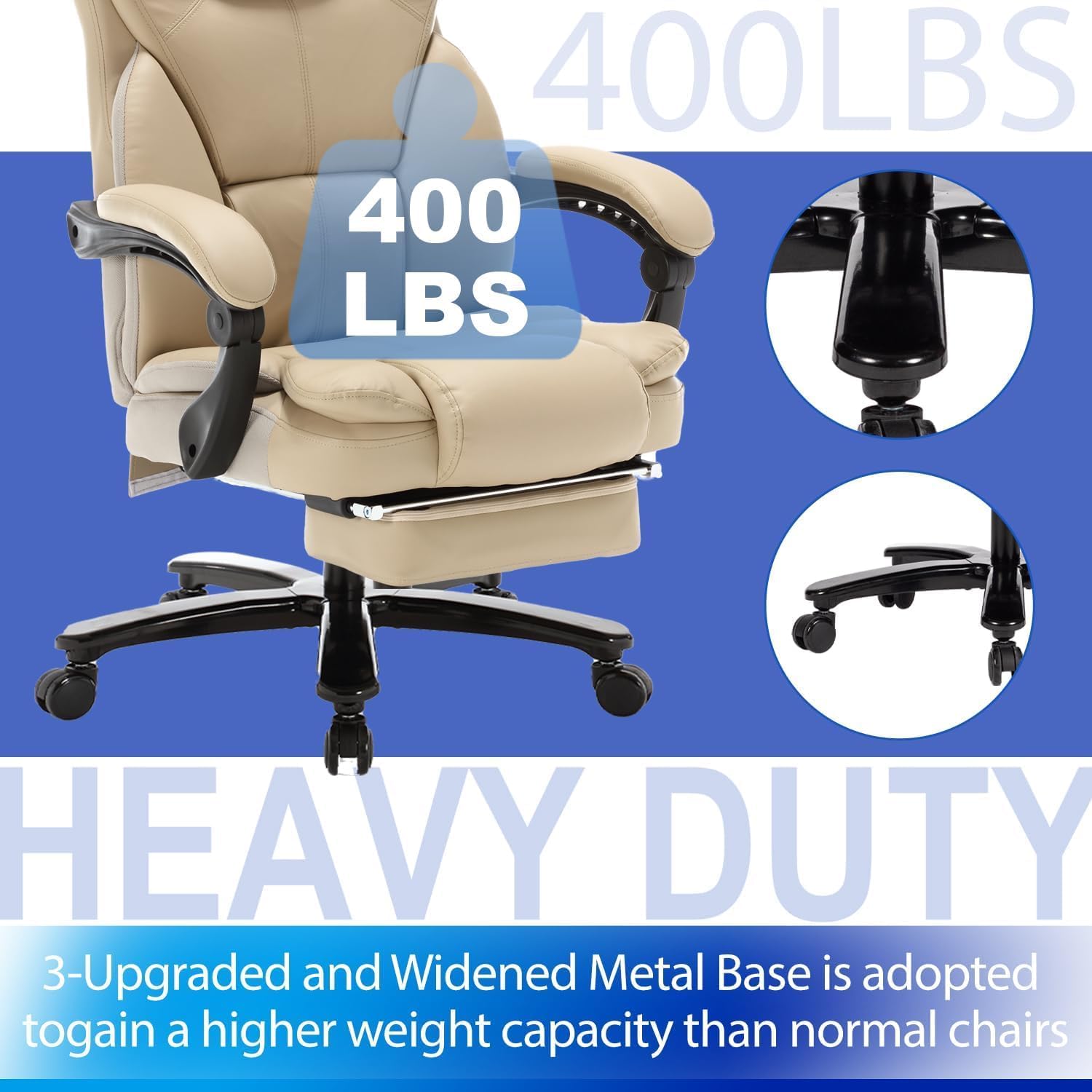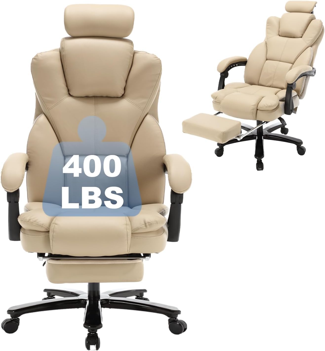linting High Back 400lbs Big and Tall Reclining Executive Office Chairs with Footrest Headrest, Ergonomic Comfortable Leather Recliner Desk Chairs, Plus Size Managerial Executive Chairs, Beige