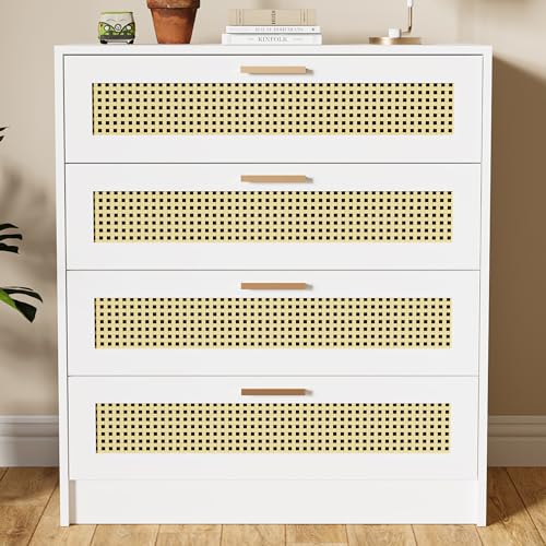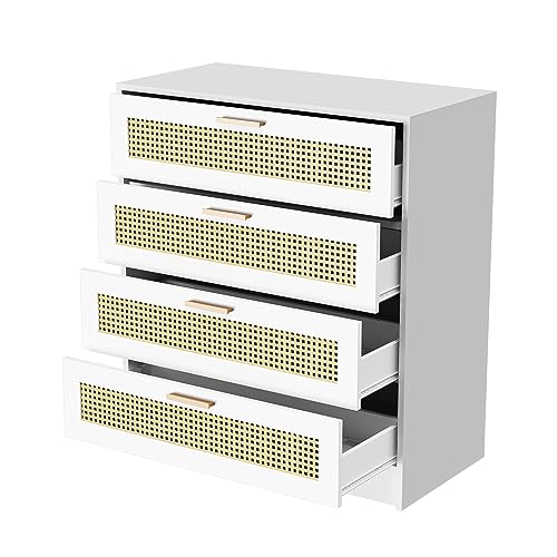 Cozy Castle Boho 4 Drawer Dresser, Wooden Chest of Drawers with Metal Handles, Modern Rattan Dresser for Bedroom, White