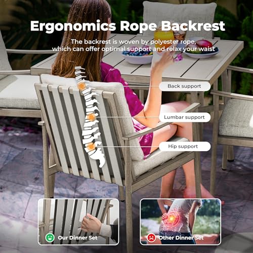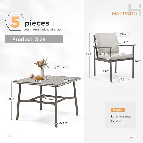HAPPATIO 5-Piece Outdoor Dining Set for 4, Aluminum Patio Dining Set includes 1 Large Square Table with Umbrella Hole and 4 Dining Chairs, Patio Furniture Set for Lawn, Porch, or Backyard (Grey)