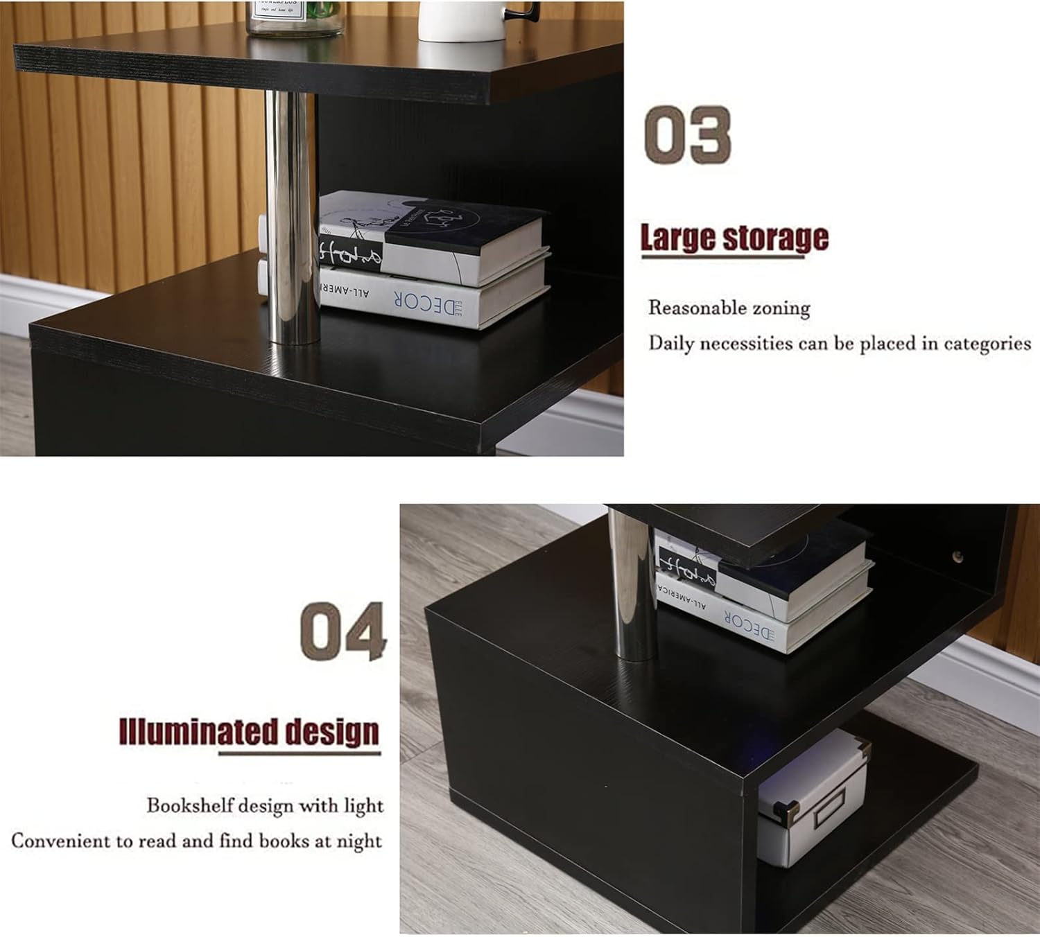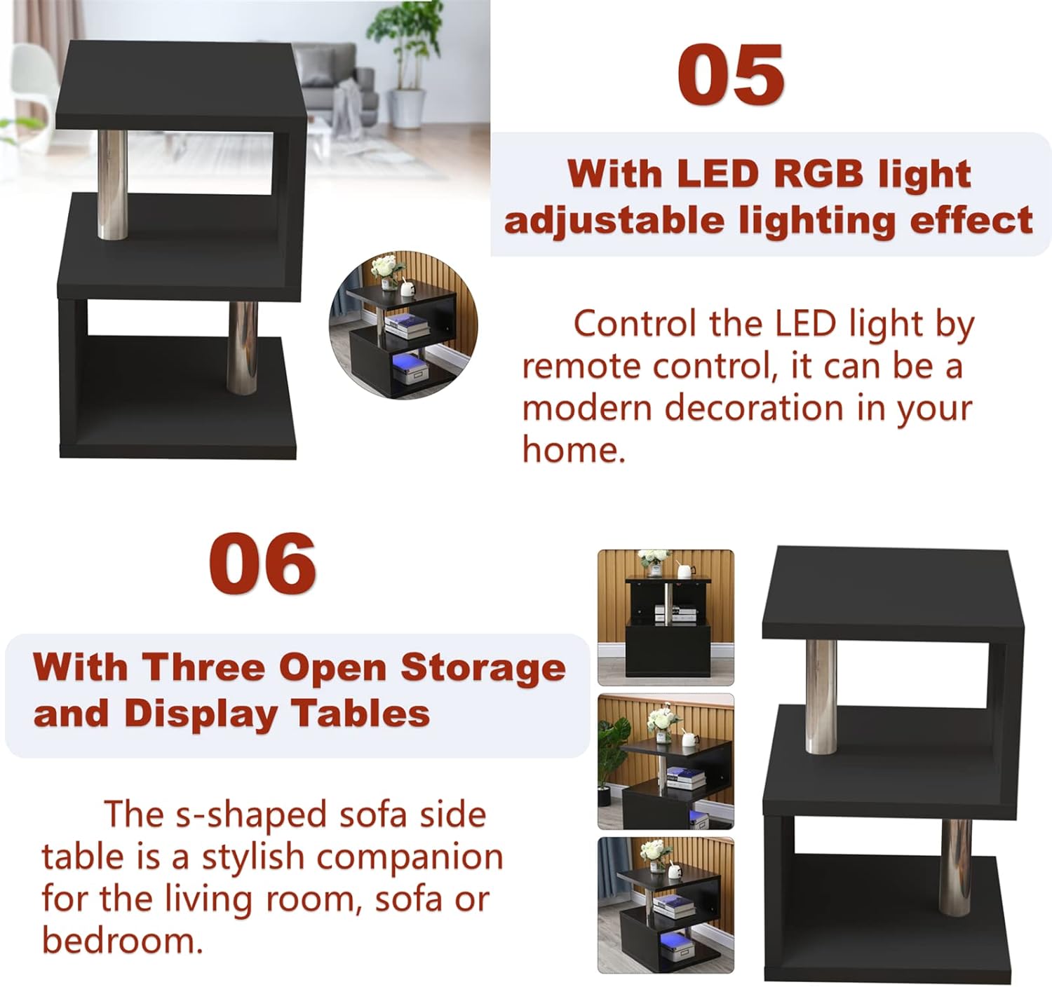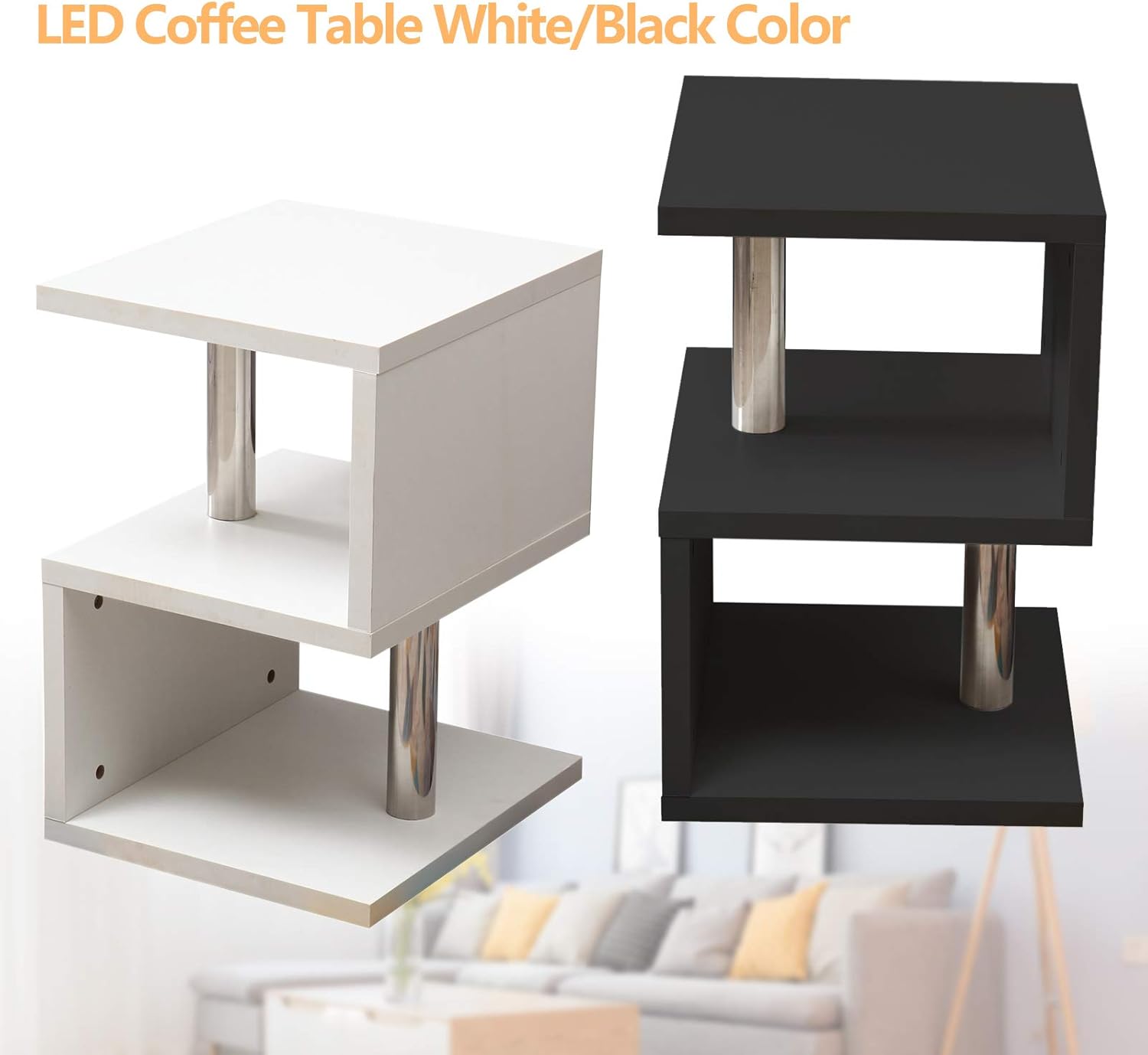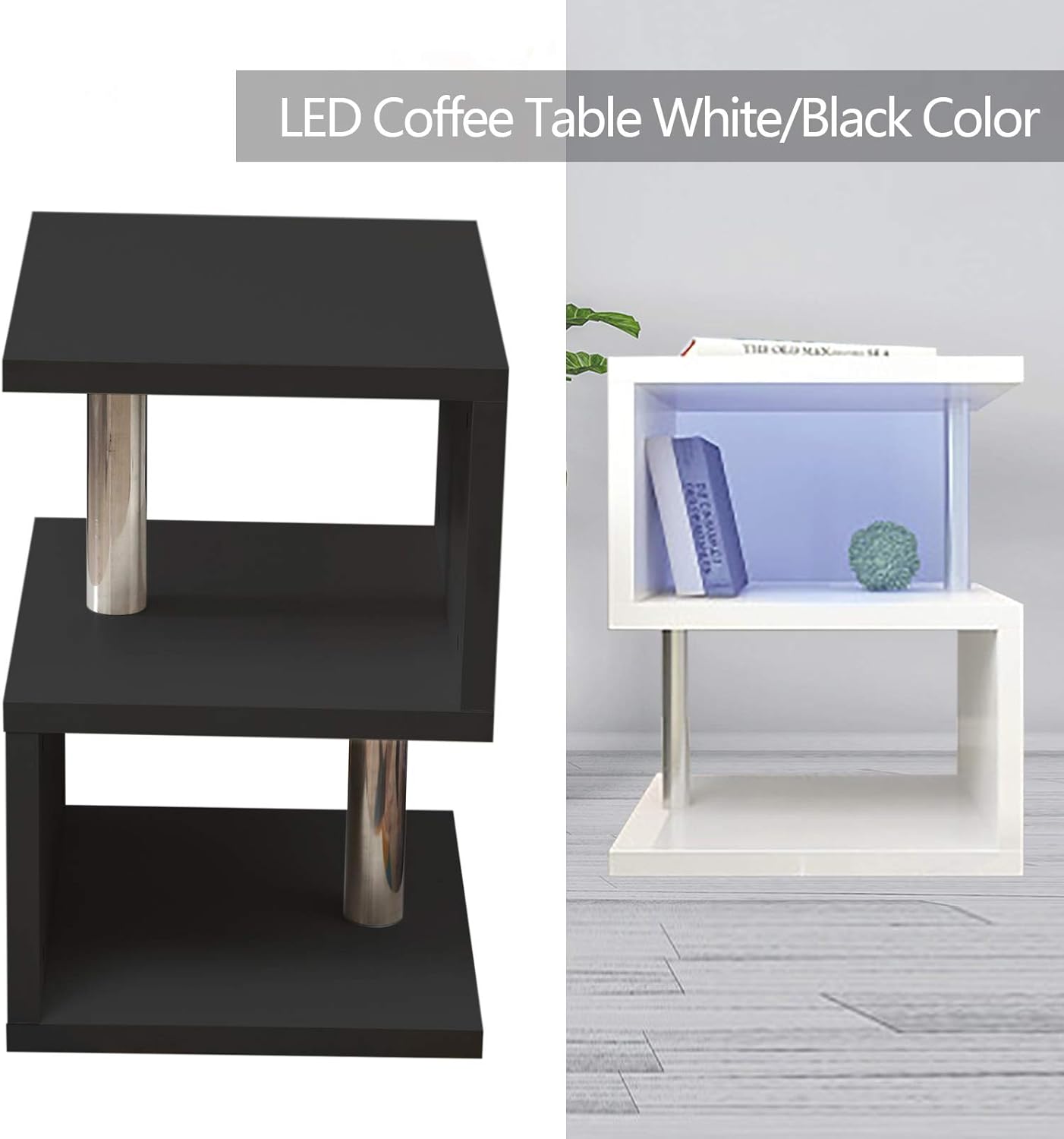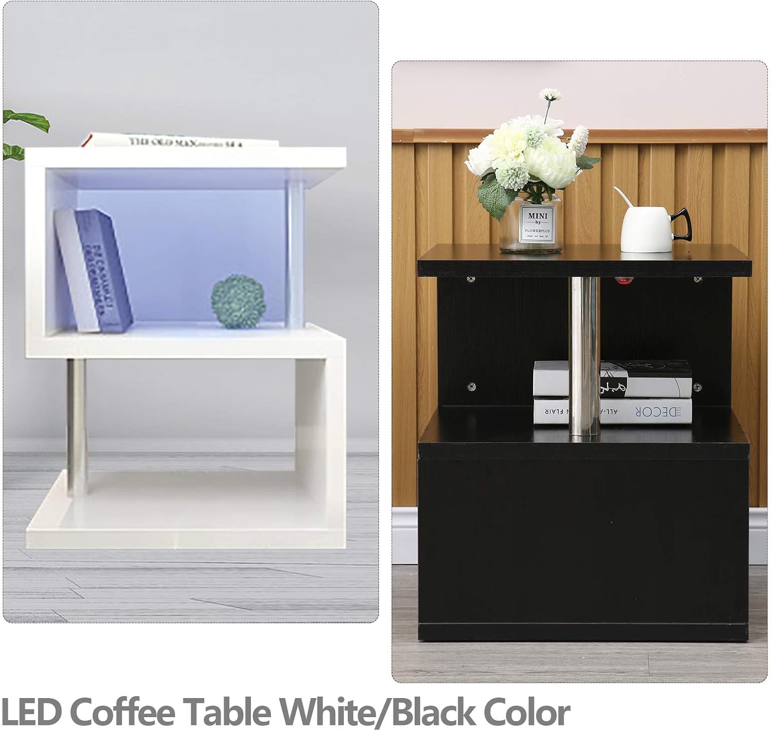 Coffee Table with LED Lights, Fashionable S-Shaped End Table with Open Storage Shelf, Modern High Gloss Tea Table LED Coffee Side Table for Living Room Bedroom, Black