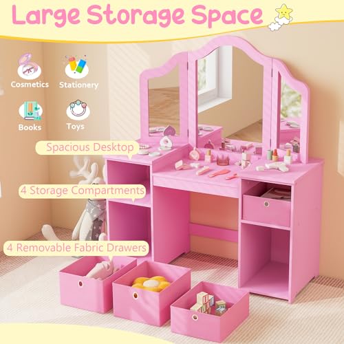 Costzon Kids Vanity, 2 in 1 Princess Makeup Desk Dressing Table with Detachable Top, Toddler Vanity with Tri-fold Mirror & Storage Shelves, Pretend Play Vanity for Little Girls, White
