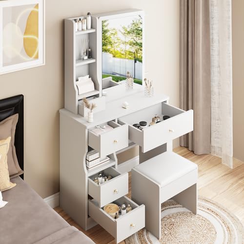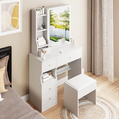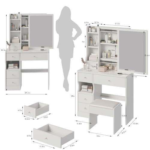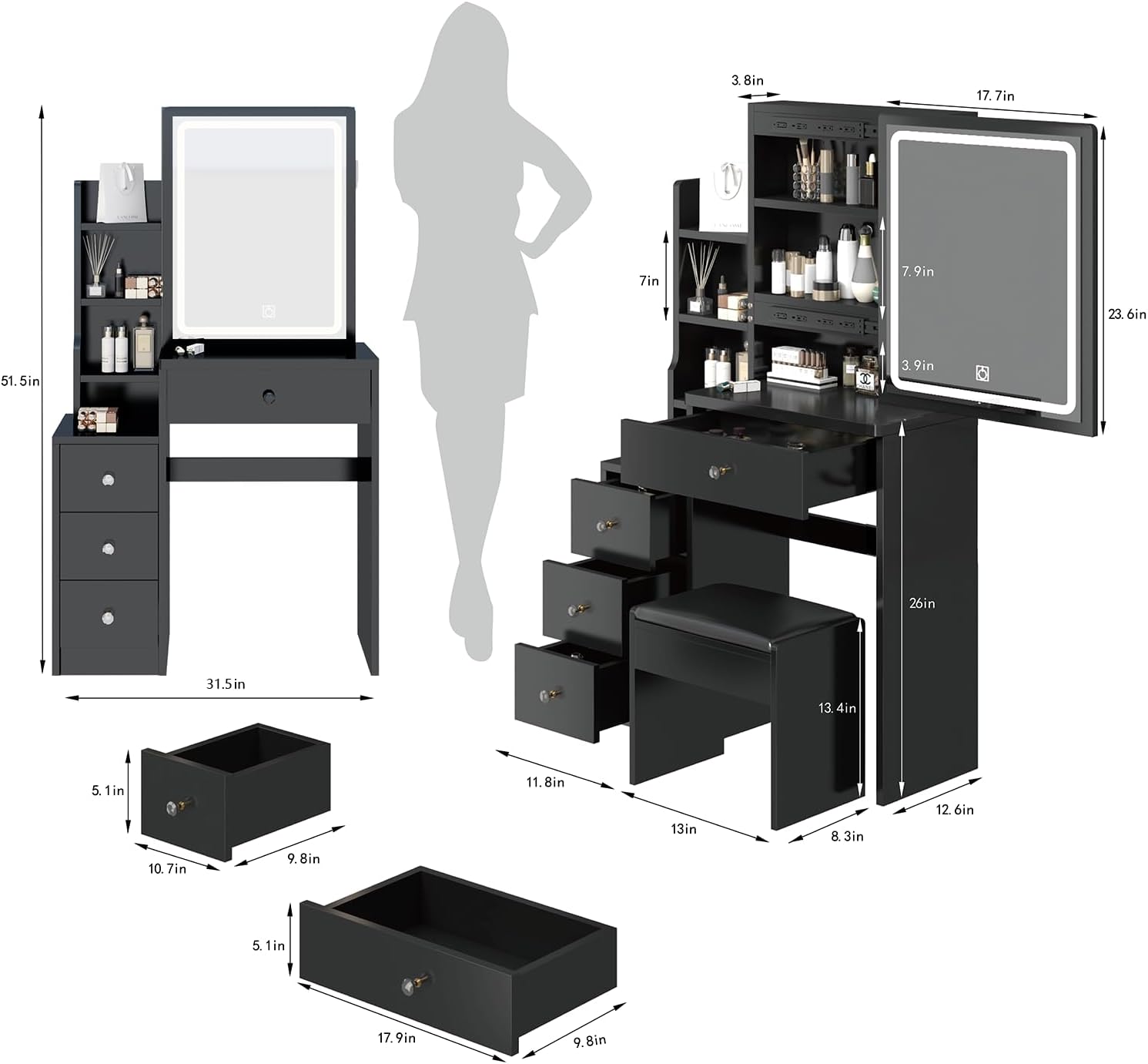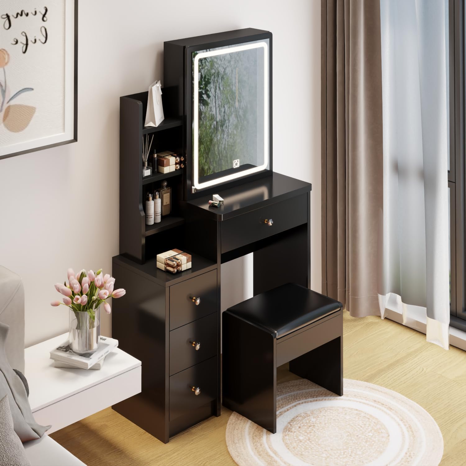 Small Space Left Drawer Desktop Vanity Table + Cushioned Stool, Extra Large Right sliding mirror, Multi Layer High Capacity Storage, Practical Fashionable Dresser, Suitable for Girls, Black