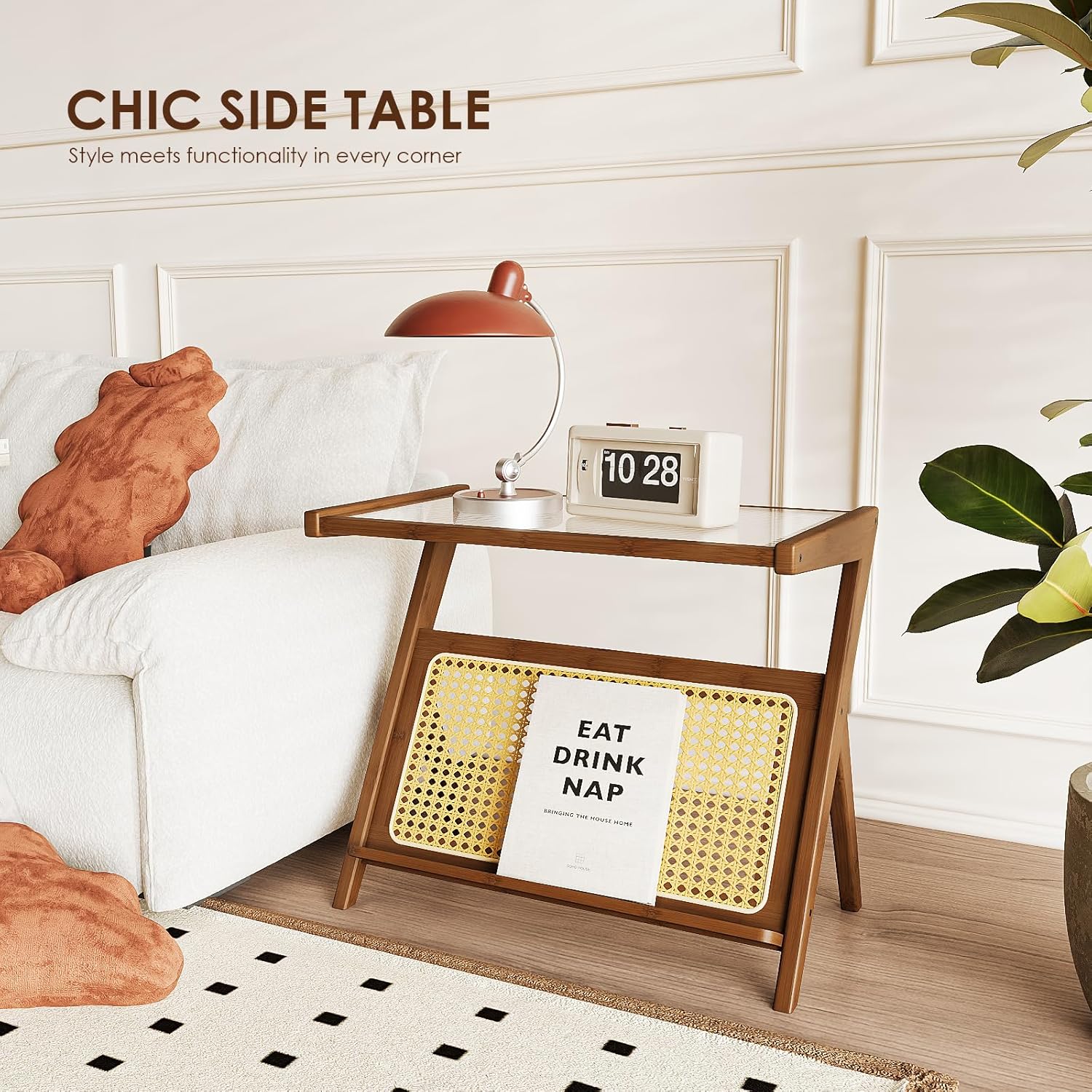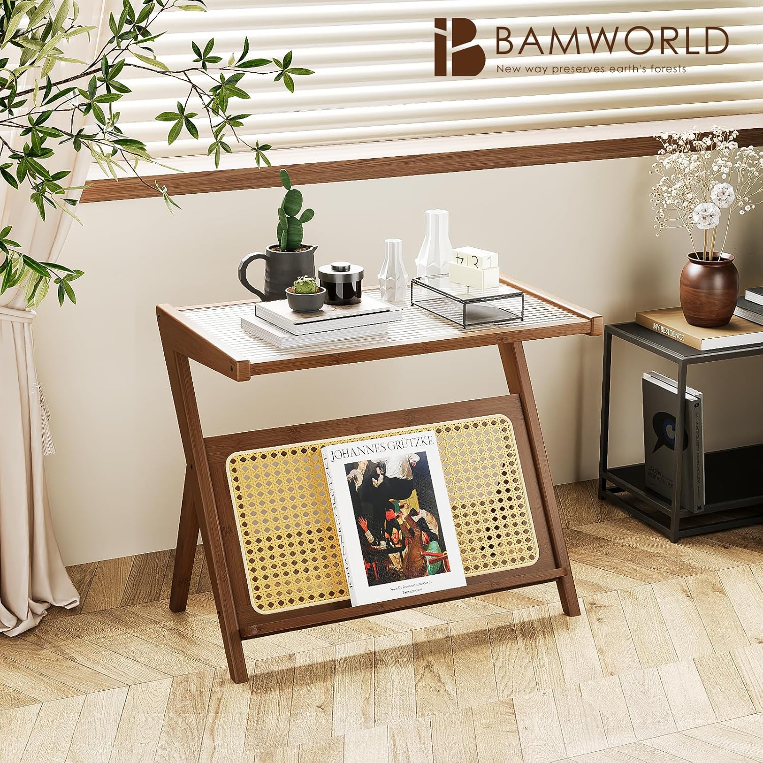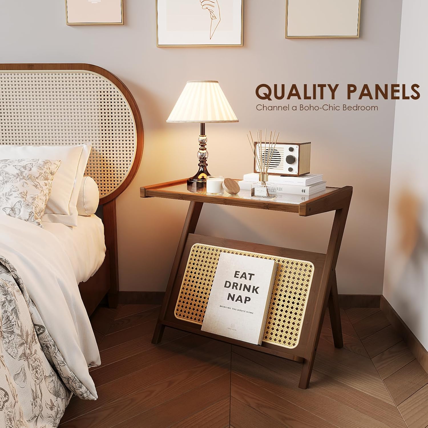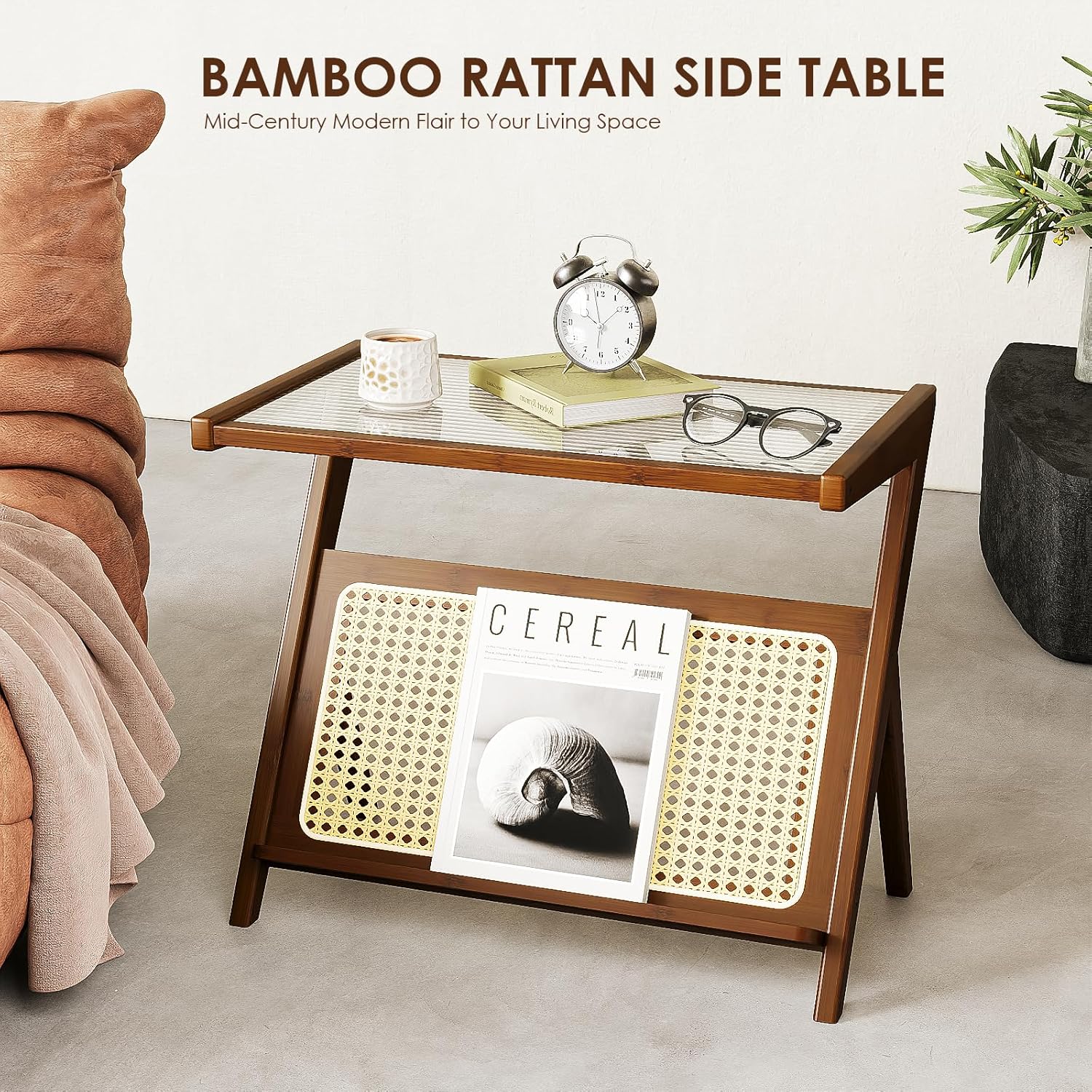 Bamworld 23.6'' L Rattan Side Table Boho NightStand Mid Century Modern End Table Glass Bedside Table Small End Tables Bamboo Coffee Table with Storage Record Player Stand for Living Room Bedroom