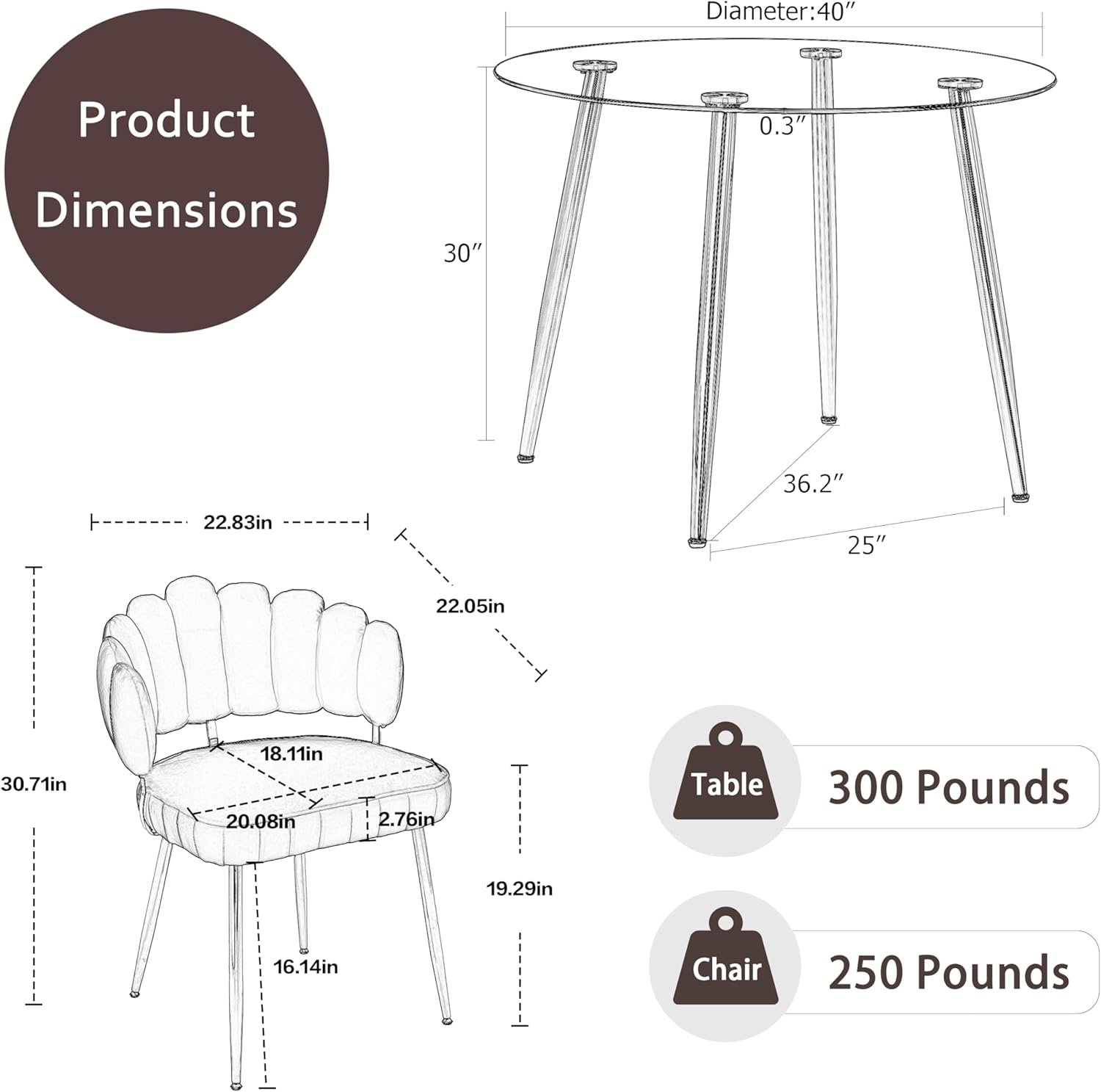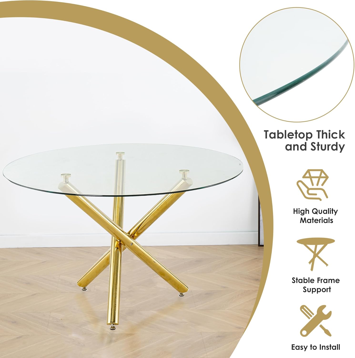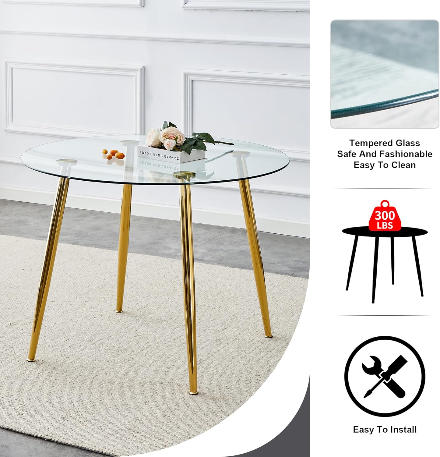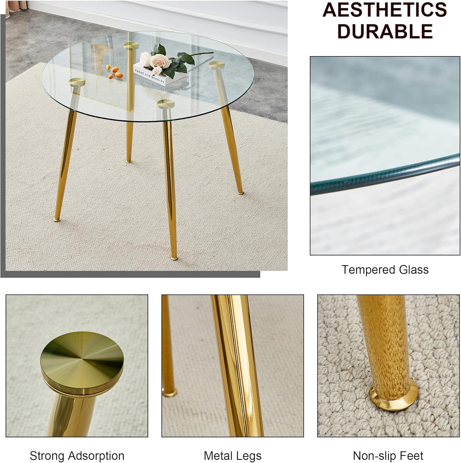 Glass Round Dining Table Set for 4, Modern Circle Dining Room Table Set, 40'' Clear Glass Top Dinner Set, 5 Pcs Retro Circular Kitchen and Green Velvet Chairs Set, for Small Place Home