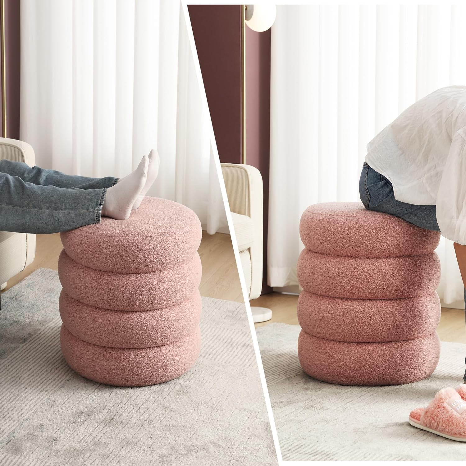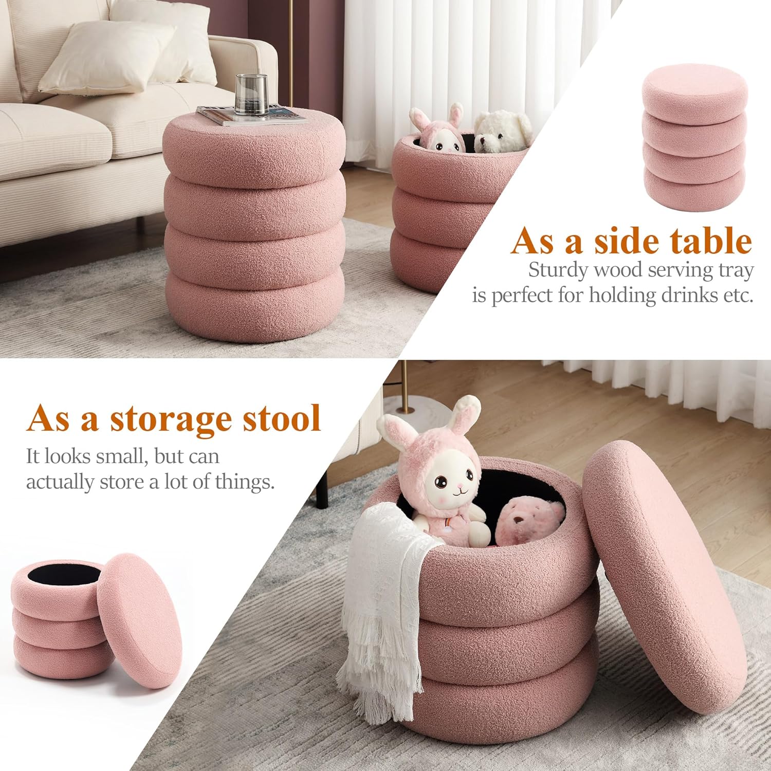 Modern Round Storage Ottoman Coffee Table Boucle Fabric, Small Sherpa Ottoman Footstool with Stripe Line, Pink Vanity Stool with Storage for Bedroom Living Room Dorm