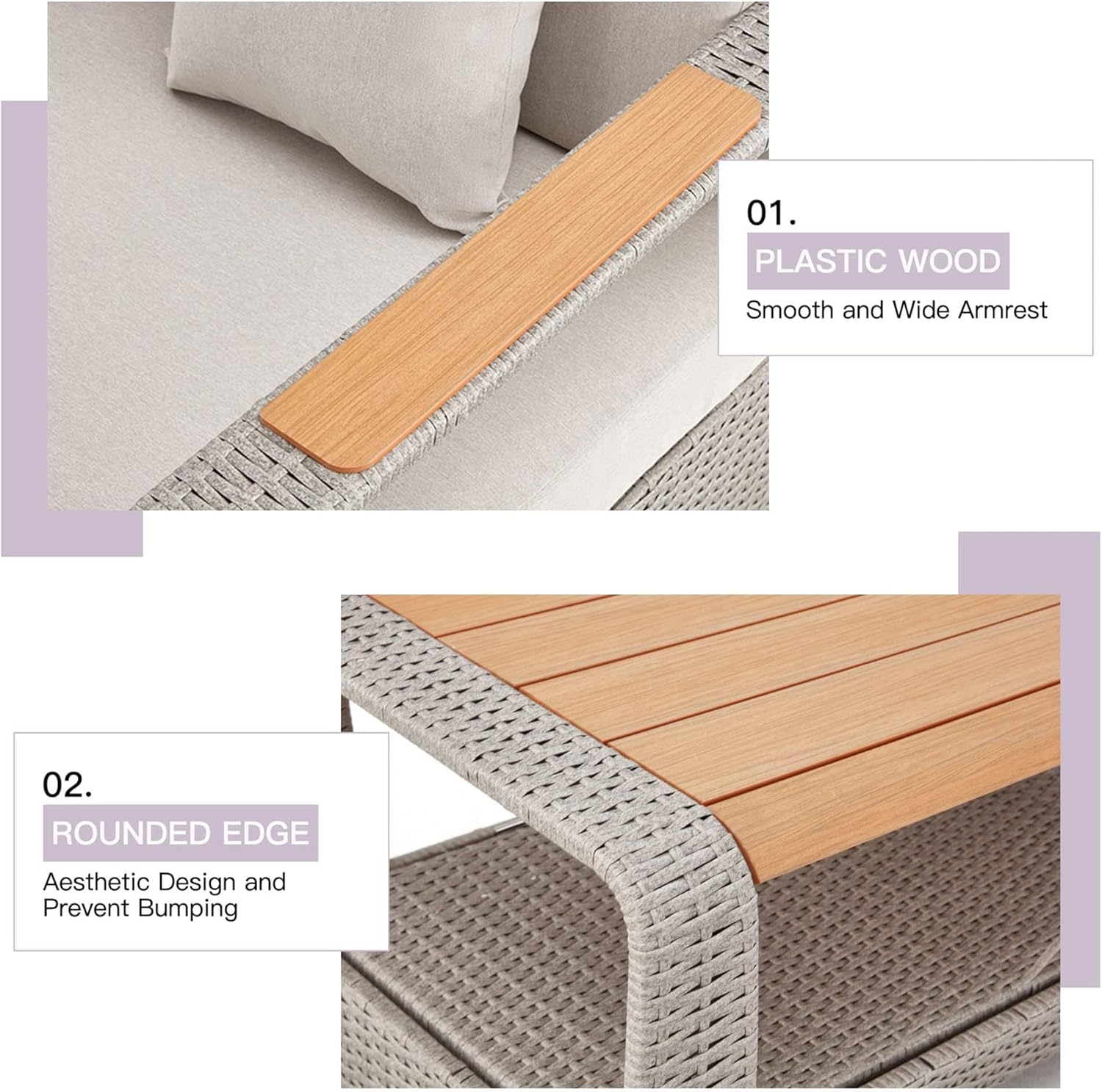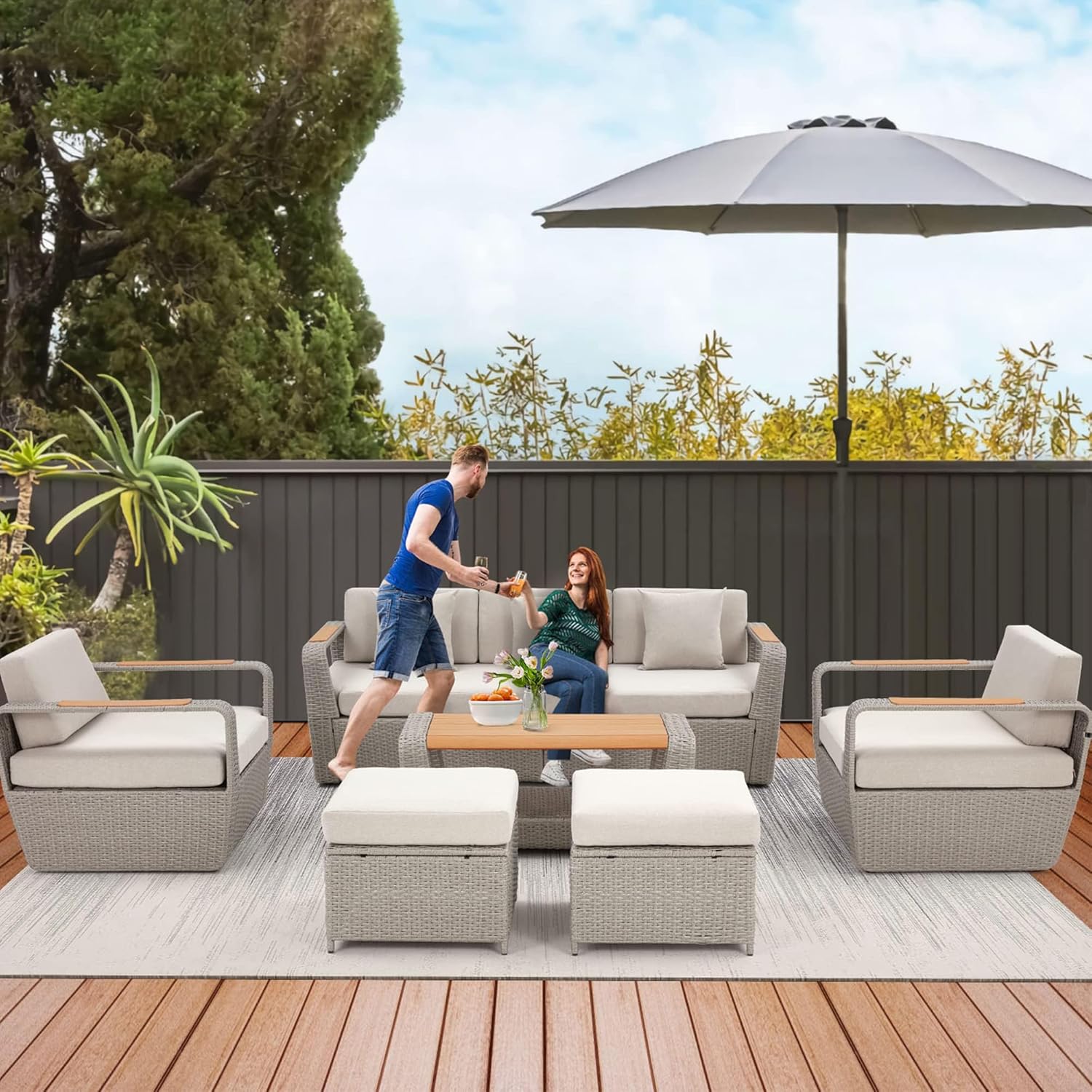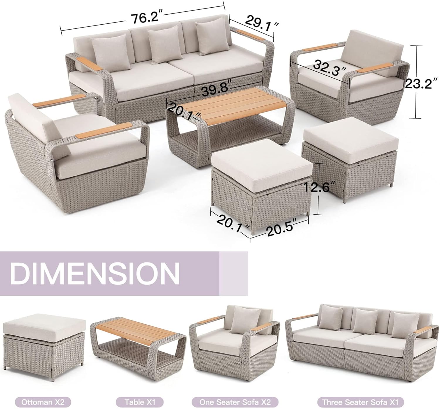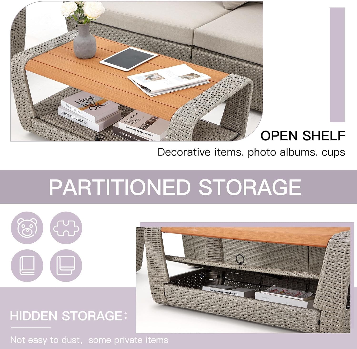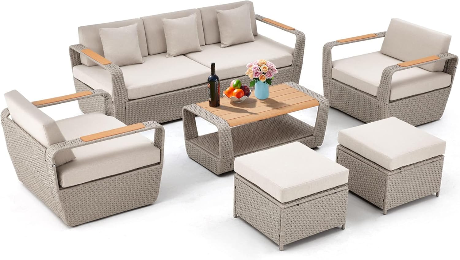 HOMREST 6 Piece Patio Furniture Set, Outdoor Sectional Conversation Rattan Sofa Set with Ottoman and Outdoor Storage Table for Garden, Porch, Backyard (Light Gray)