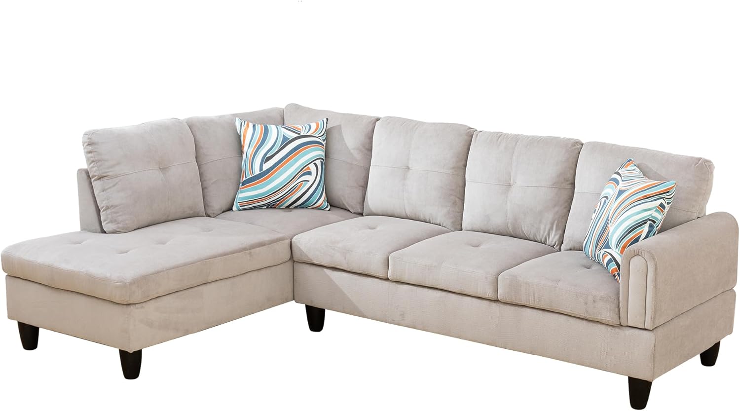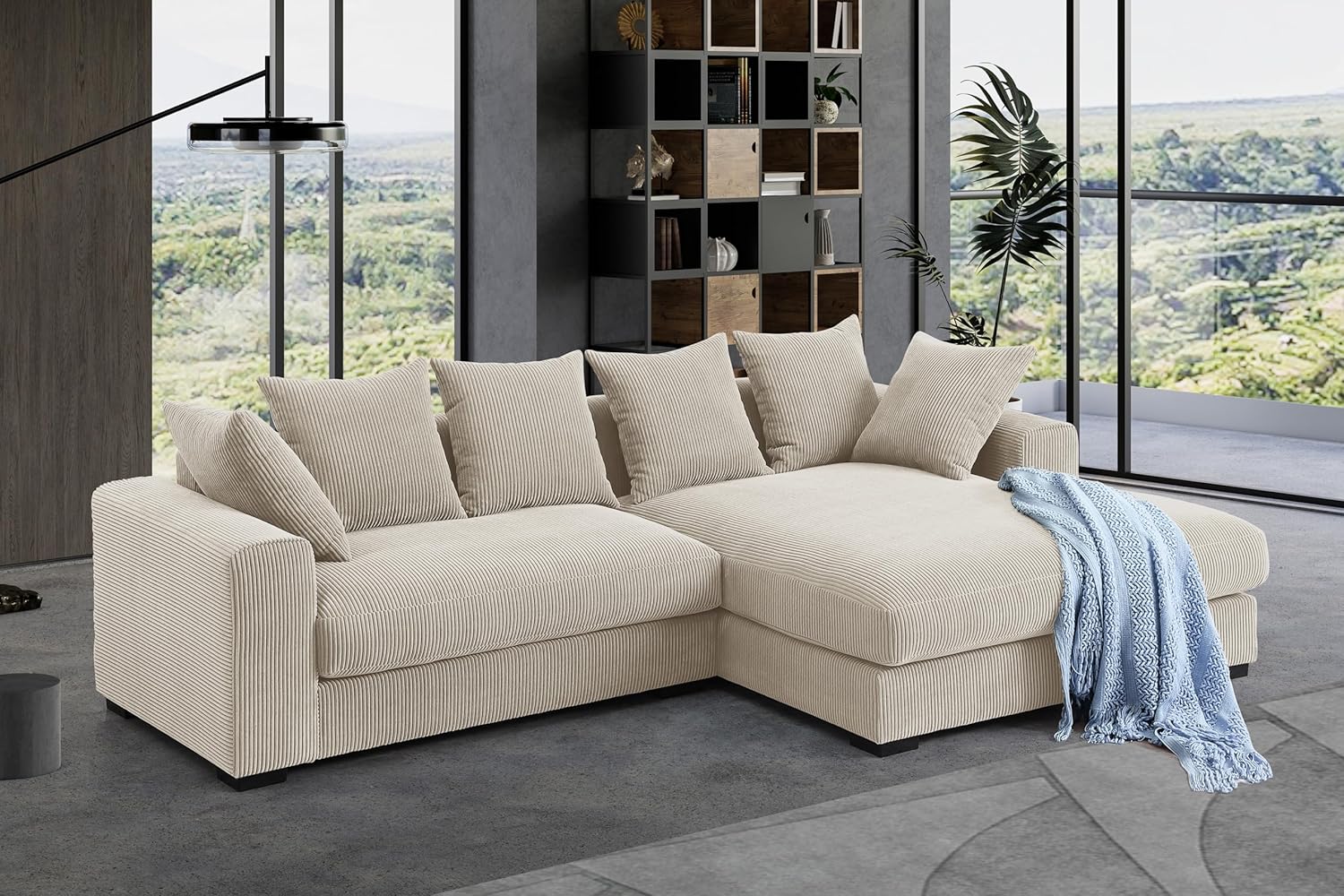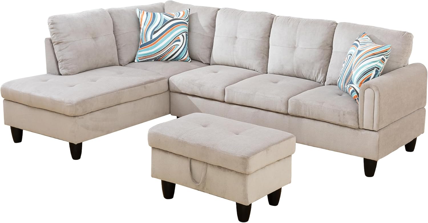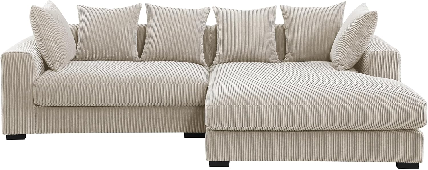 Corduroy 3-Piece Upholstered Sectional Chaise,L Shaped Sofa with Versatile Ottoman and Six Complementary Toss Pillows for Living Room,Apartment,Office,Beige