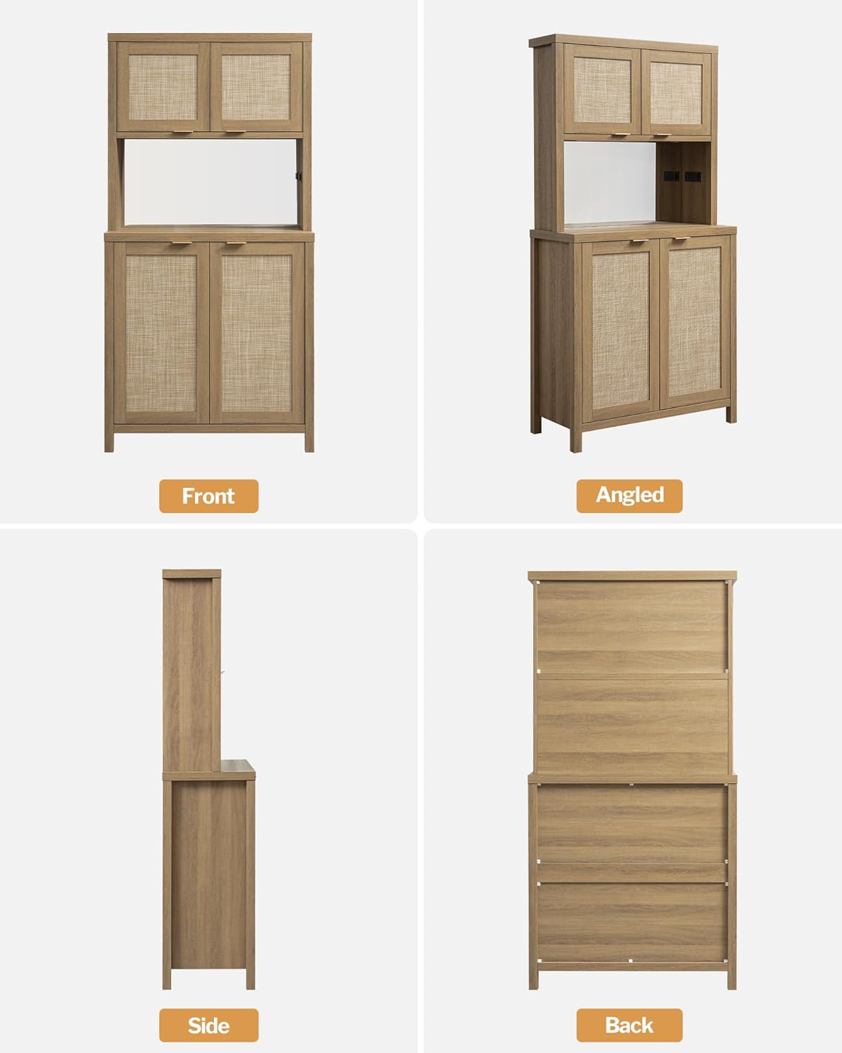 SICOTAS Rattan Pantry Kitchen Storage Cabinet: Tall Pantry Cabinet with Rattan Door, Steel Mirror, Power Outlet, Boho Large Freestanding Cupboard Wood Cabinet for Kitchen, Dining Room, Natural Oak