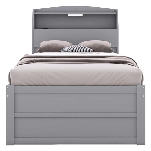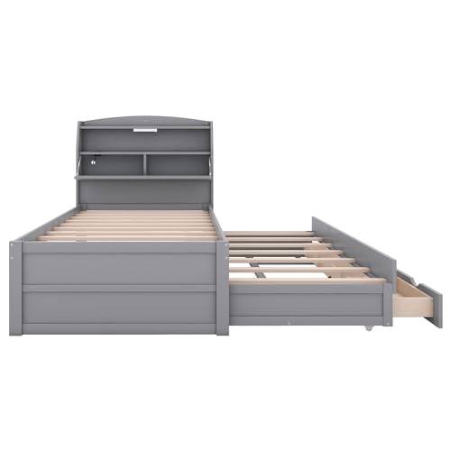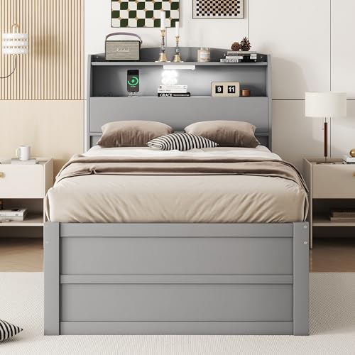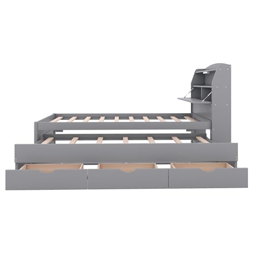 CITYLIGHT Full Bed Frame with Trundle & Bookcase Headboard, Wood Full Captain Bed, Full Size Platform Bed with Charging Station & LED Lights for Kids Teens Boys Girls,White