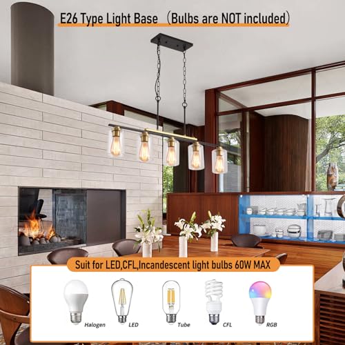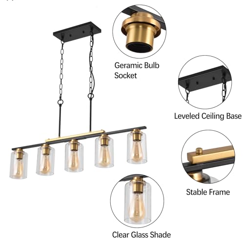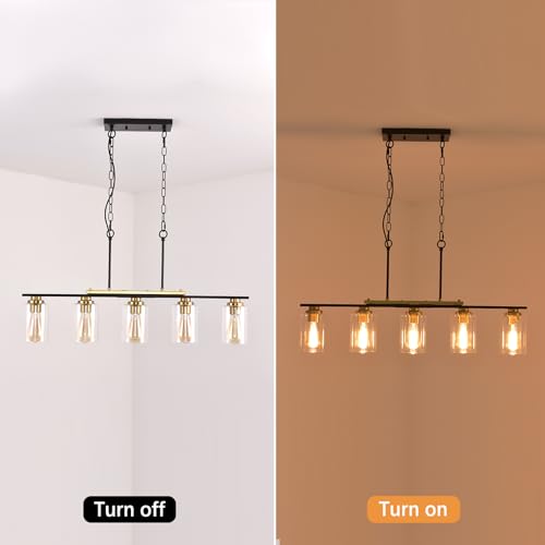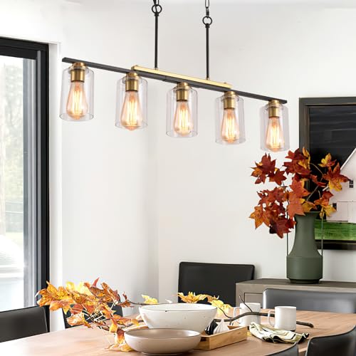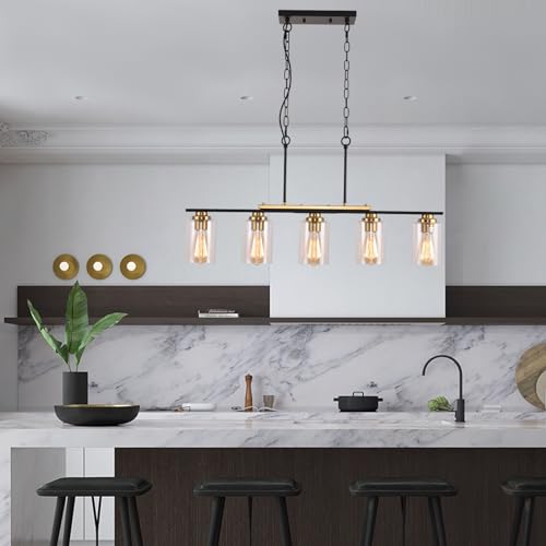 Kitchen Island Lighting,5-Light Farmhouse Pendant Lights,Black Kitchen Pendant Lighting Fixture Over Island with Glass Shade and Adjustable Rods (Bulb not Included)