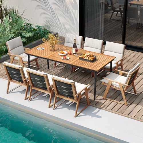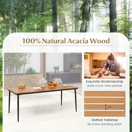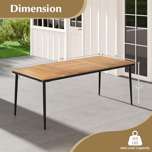 Tangkula Outdoor Dining Table for 8, 79 Inch Acacia Wood Patio Table with 1.9” Umbrella Hole, Metal Frame & Adjustable Foot Pads, Indoor Bistro Table for Poolside, Garden & Deck