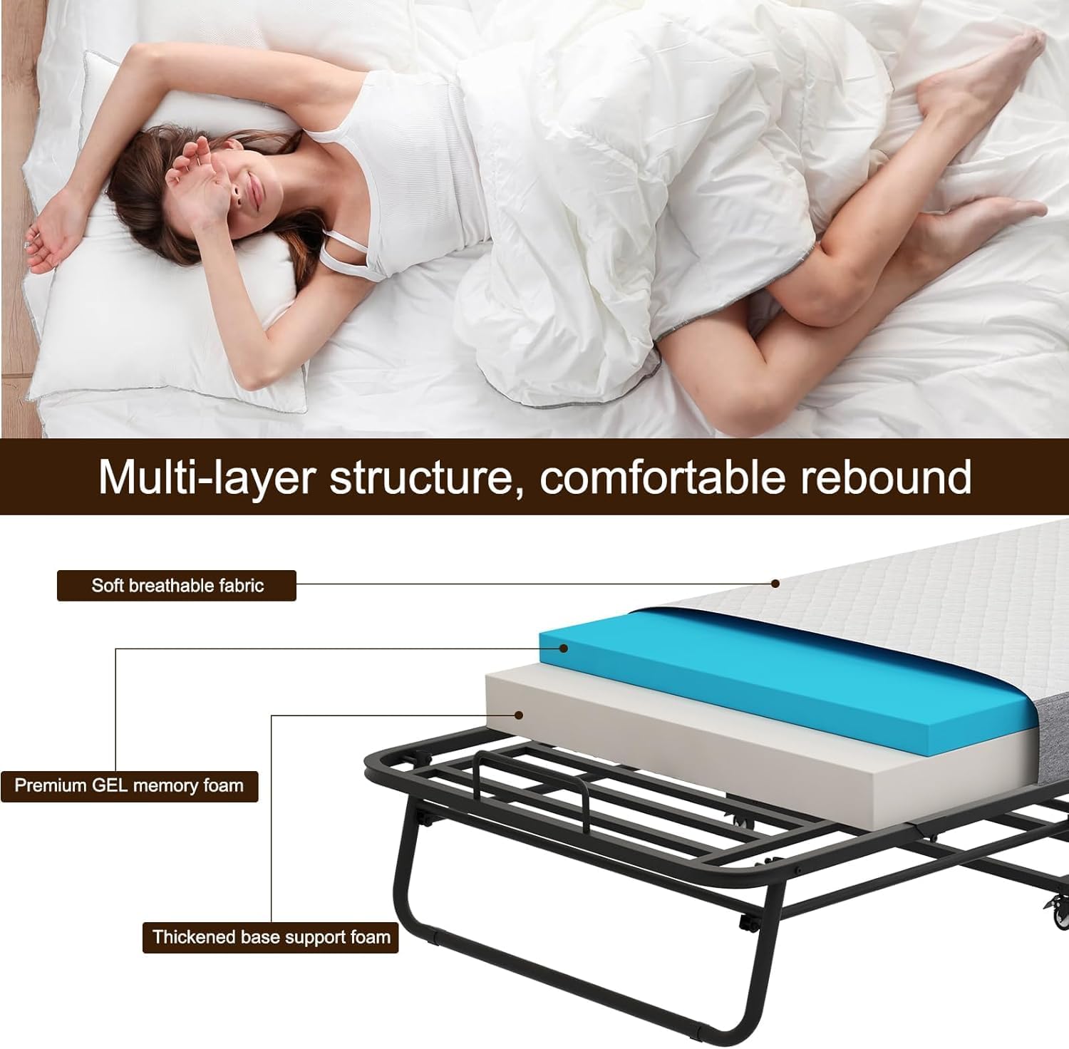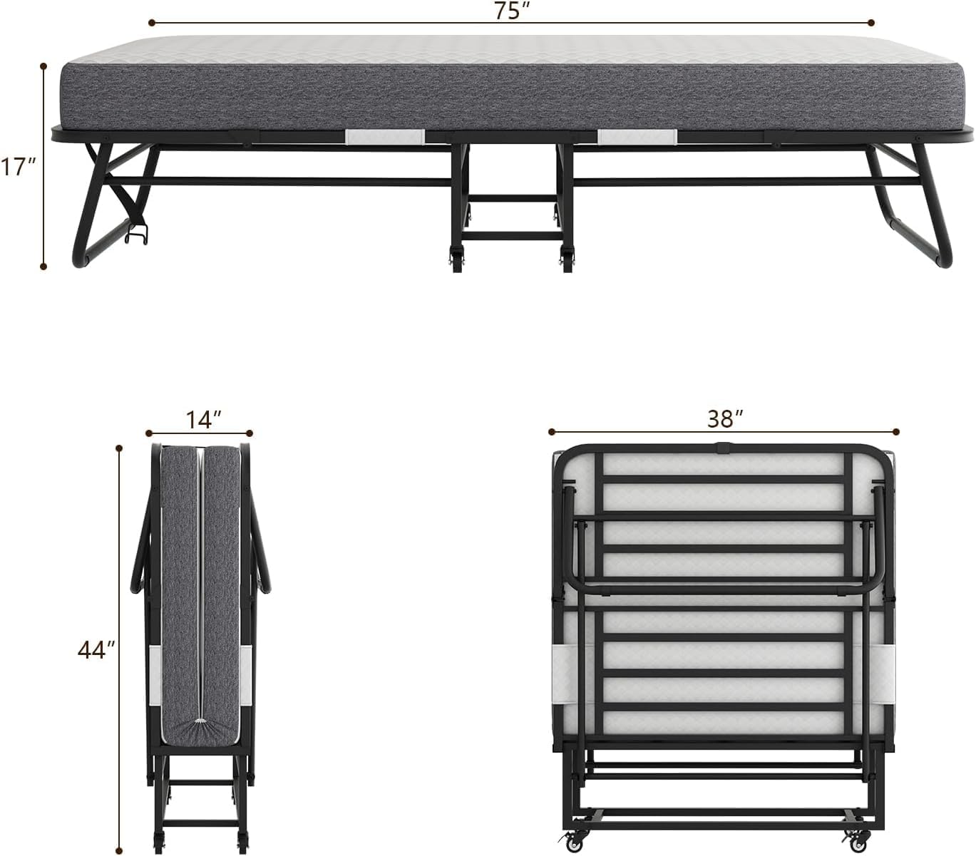 Folding Bed with Mattress Portable Foldable Rollaway Adult Bed for Guest Twin Size 75x38 inches Fold-up Metal Bed Frame with Memory Foam Mattress