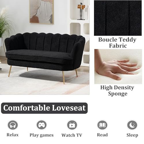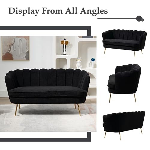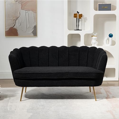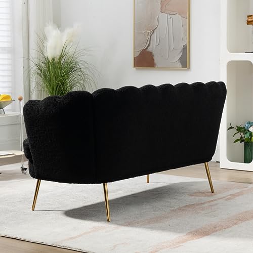 Boucle Fabric Small Loveseat Sofa with Gold Metal Legs, 59” Modern 2 Seater Sofa with Flower Backrest, Couch for Living Room Bedroom Office (Caramel)