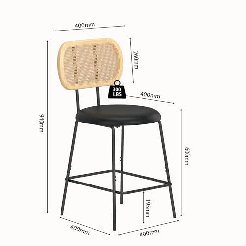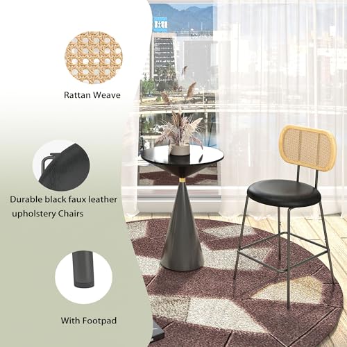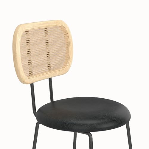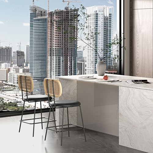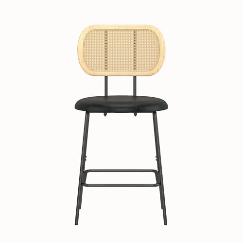 Upholstered Counter Height Dining Chair with Black Metal Legs and Back, PU& Rattan Industrial Side Chair with Leisure, Accent Desk Chair for Kitchen Living Room Wine Bar(Black Set of 2)