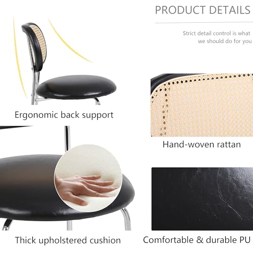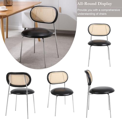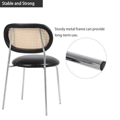 Tufted Upholstered Dining Chair with Silver Metal Legs and Back, PU& Rattan Industrial Side Chair with Leisure and Leveling Feet, Accent Desk Chair for Dining Room Bedroom(Brown Set of 2)