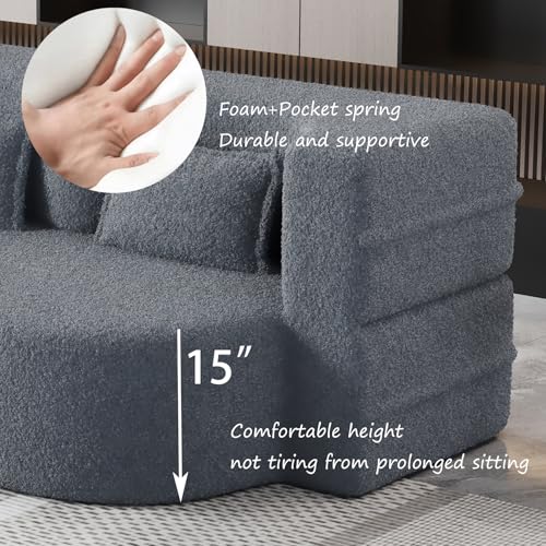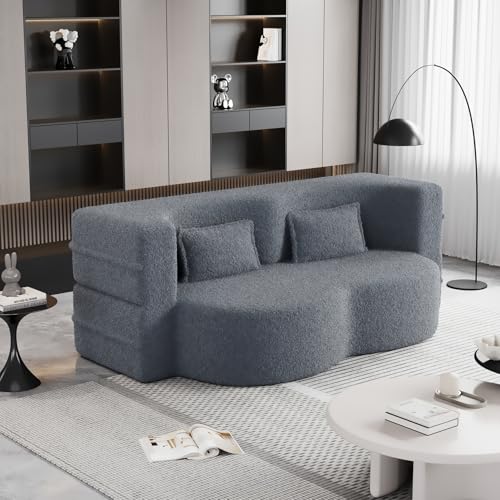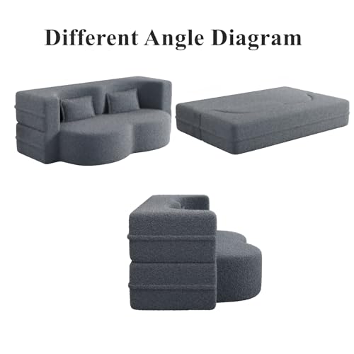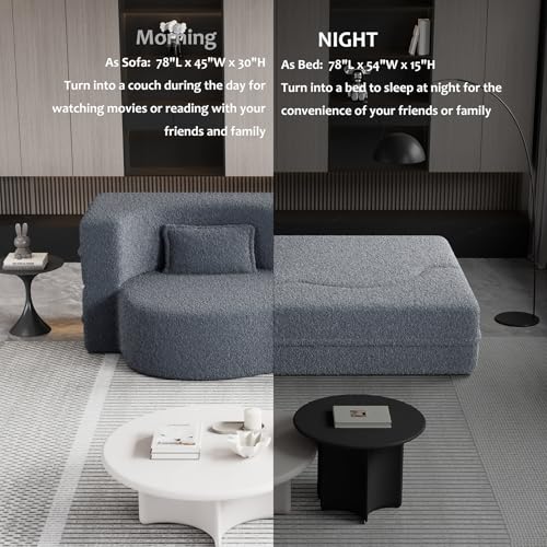 Convertible Floor Sofa Bed, 15" Thick Full Size Foam Mattress Sleeper Sofa with 2 Pillows, Comfortable Teddy Fabric Folding Loveseat Couch for Living Room, Guest Room (Pink)