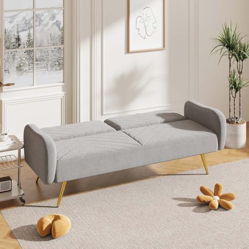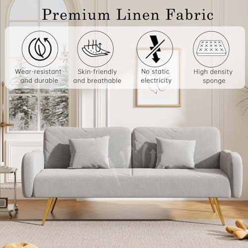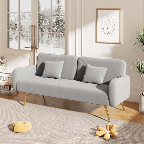 70“ Futon Bed with Mattress Included,Futon Couch Sofa Bed w/ Split Backrest and 2 Throw Pillows,Convertible Loveseat Sleeper w/ Gold Metal Legs and Arms for Living Room Bedroom Small Space (Pink)