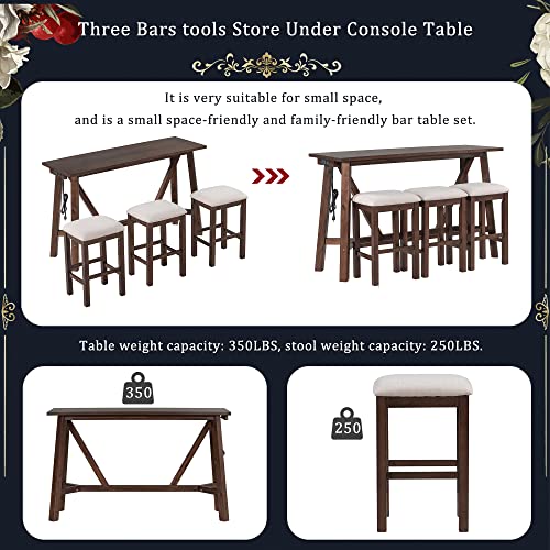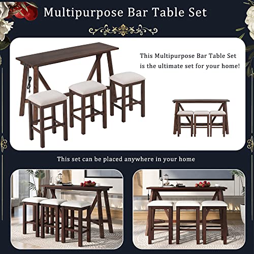 P PURLOVE 4 Piece Counter Height Bar Table Set,Long Console Table with 3 Stools Multipurpose Dining Table Set with Socket,Rustic Bar Table Set,Gray Green