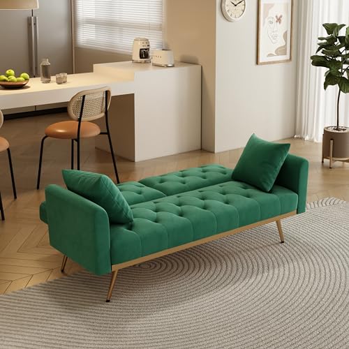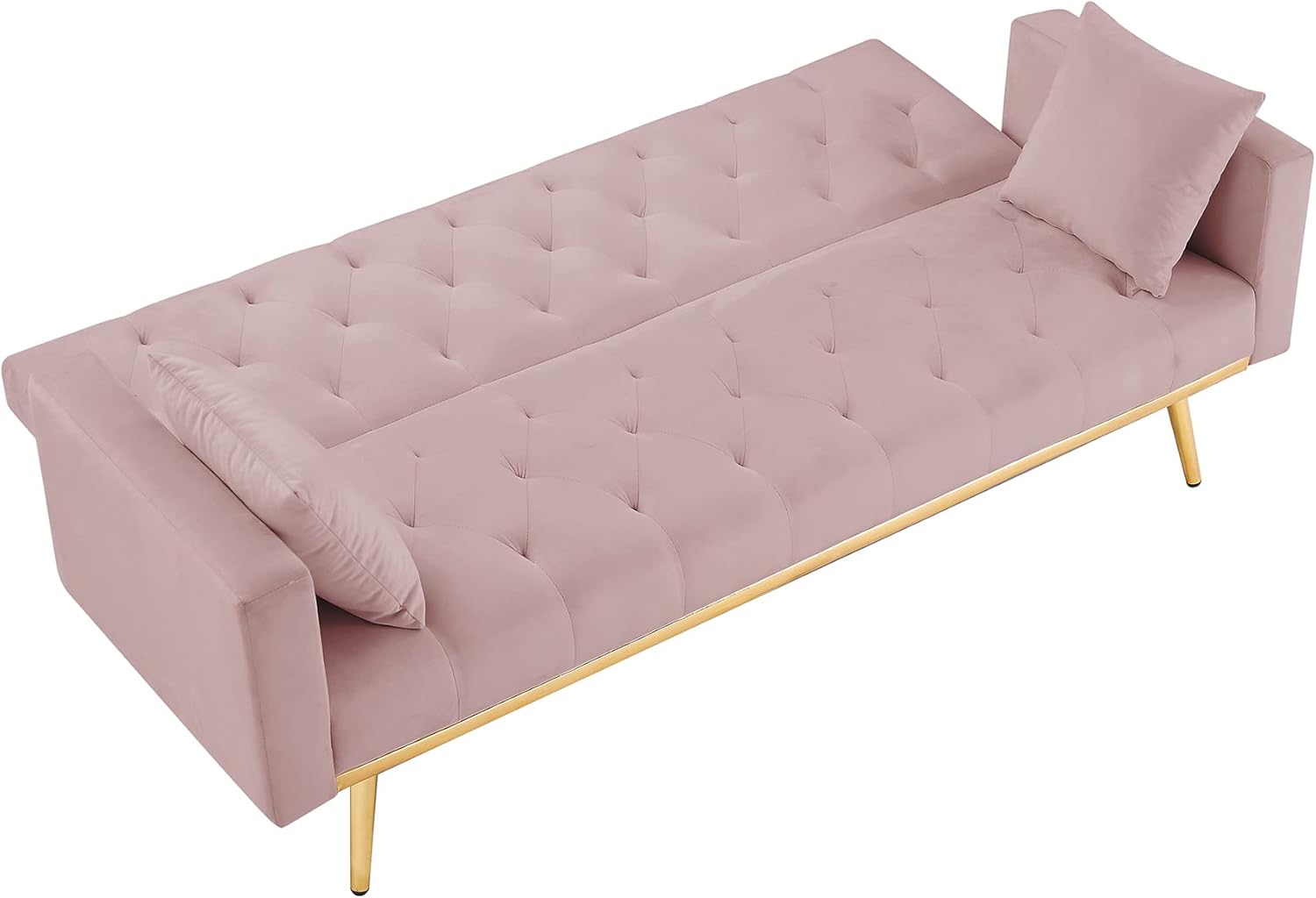 75" Velvet Couch, Futon Sofa Bed, Sleeper Sofa with Adjustable Back, Loveseat, Mid Century Modern Couches with Folding Armrests for Living Room, Bedroom,Small Spaces (Pink)