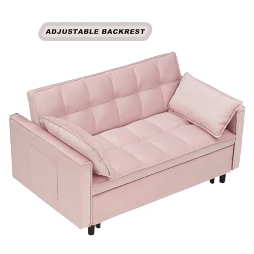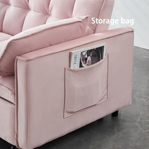 3 in1 Multi-Function Loveseat Sleeper Sofa Bed with Storage Pockets, Velvet Convertible Chaise Lounge Sofa Bed, Pull-out Sofa Bed with Adjustable Backrest and Pillows (Pink)