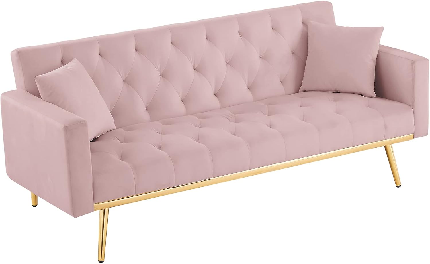 68.3" Velvet Futon Sofa Bed with Nail Head Trim and Gold Metal Legs, Convertible Sleeper Bed with 2 Pillows, Modern Loveseat for Living Room, Bedroom (Pink)
