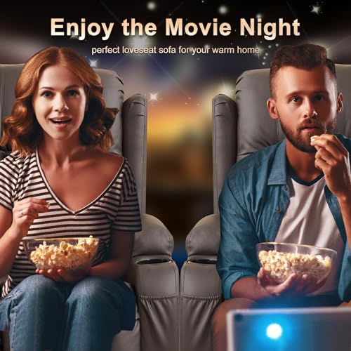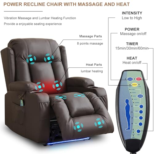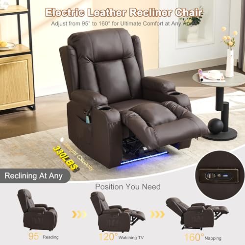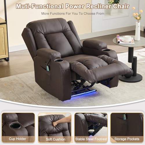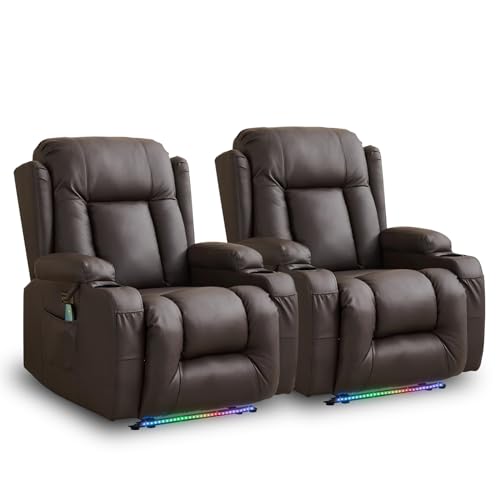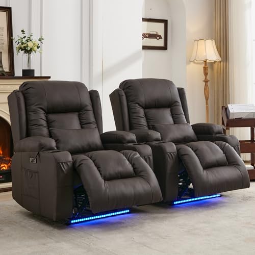 IPKIG Power Recliner Chair with Led Light - Faux Leather Overstuffed Home Theater Recliner w/Massage Heat/Lumbar Pillow/USB Port/Cup Holders/Side Pockets, Movie Gaming Reclining Chair (2 Sets, Brown)