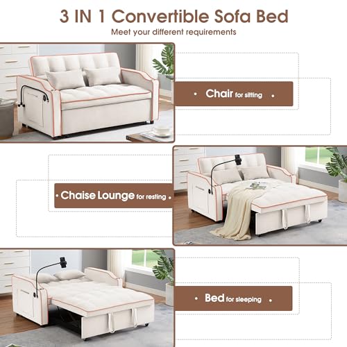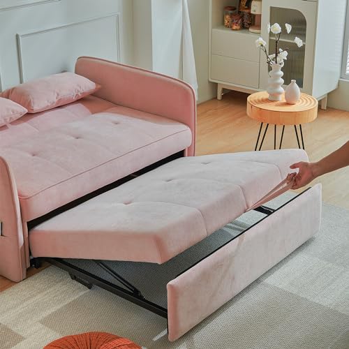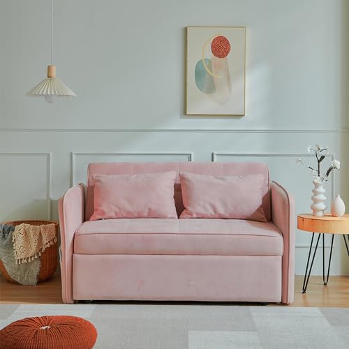 53.50" Convertible, 3-in-1 Sleeper Sofa with Pull-Out Bed, Fabric Futon Couch with Adjustable Armrests, Modern Loveseat for Living Room Apartment, 1, Pink