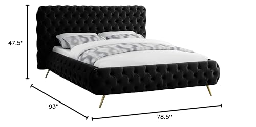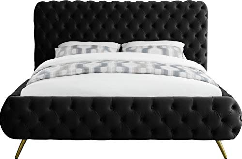Meridian Furniture Delano Collection Modern | Contemporary Velvet Upholstered Bed with Deep Button Tufting and Custom Gold Metal Legs, Queen, Black