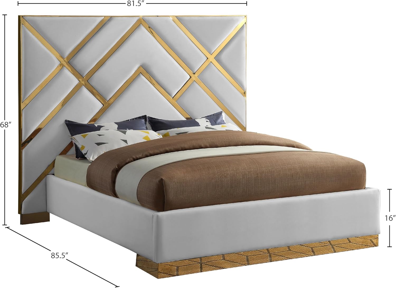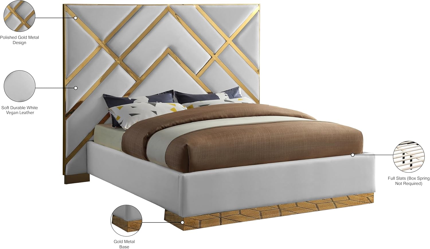 Meridian Furniture VectorWhite-Q Vector Collection Modern | Contemporary Vegan Leather Upholstered Bed, Custom Gold Metal Base and Polished Gold Metal Design, 81.5" W x 85.5" D x 68" H, White, Queen