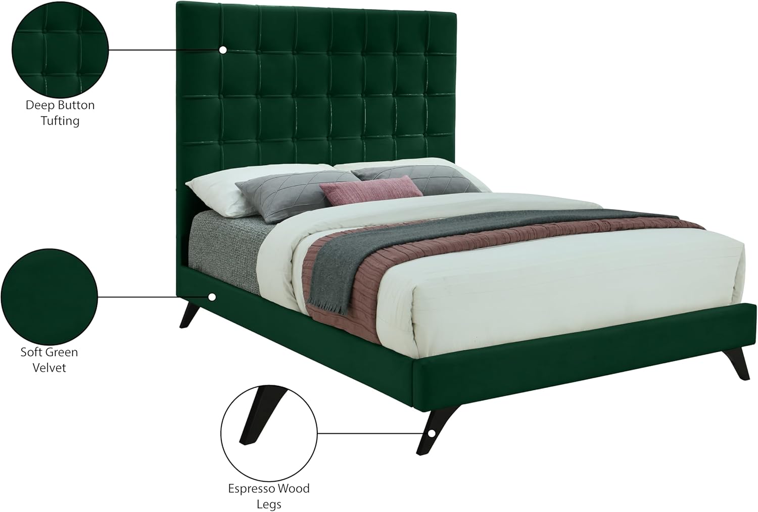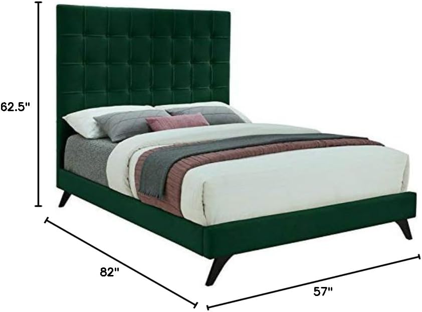 Meridian Furniture Elly Collection Modern | Contemporary Velvet Upholstered Bed with Deep Button Tufting and Custom Espresso Wood Legs, Full, Green
