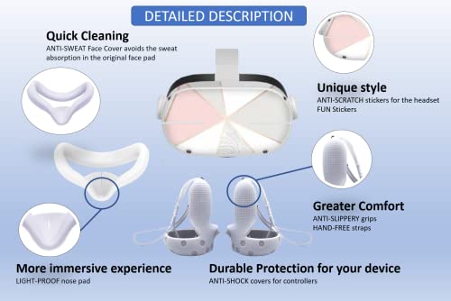 Set 3-in-1 Compatible with Oculus Quest 2/Meta Accessories: Anti-Leakage Face Cover + Non-Slip Grip Covers + Stickers | Sweatproof Anti-Dirty Virtual Reality Decal Skin (White Pearl)