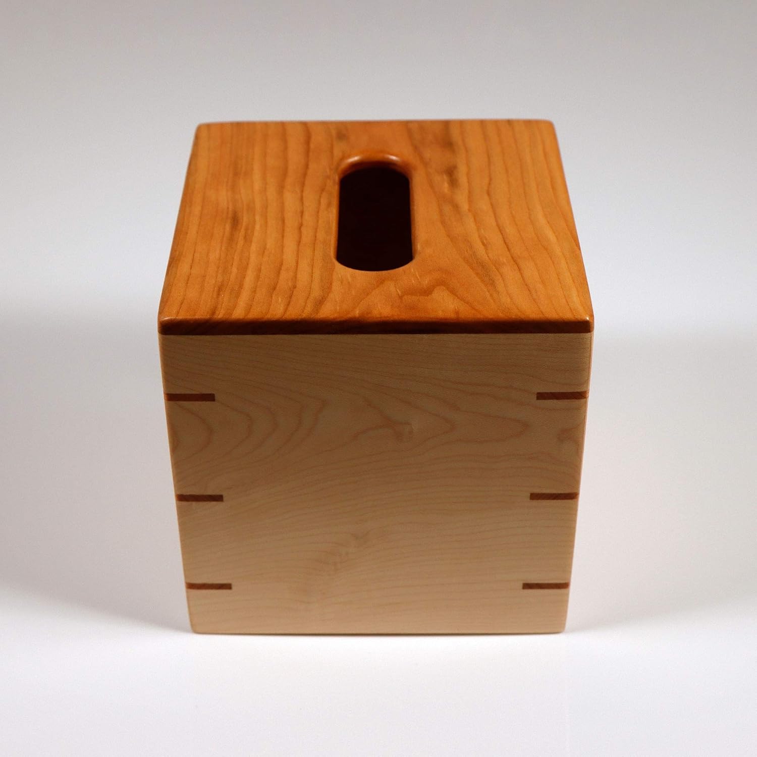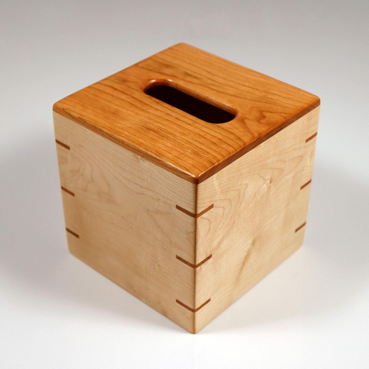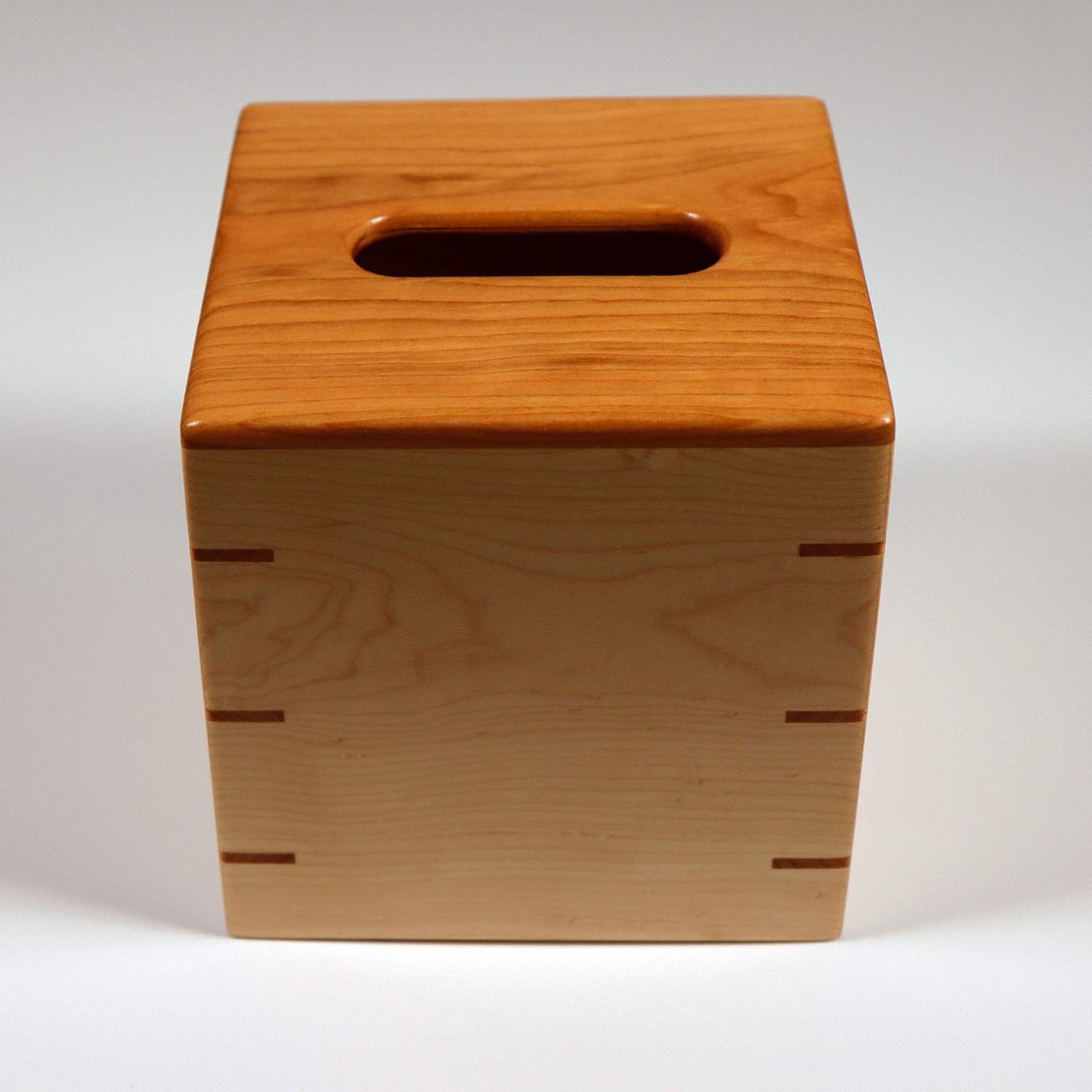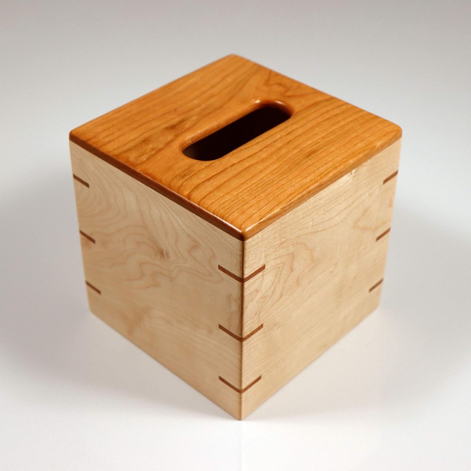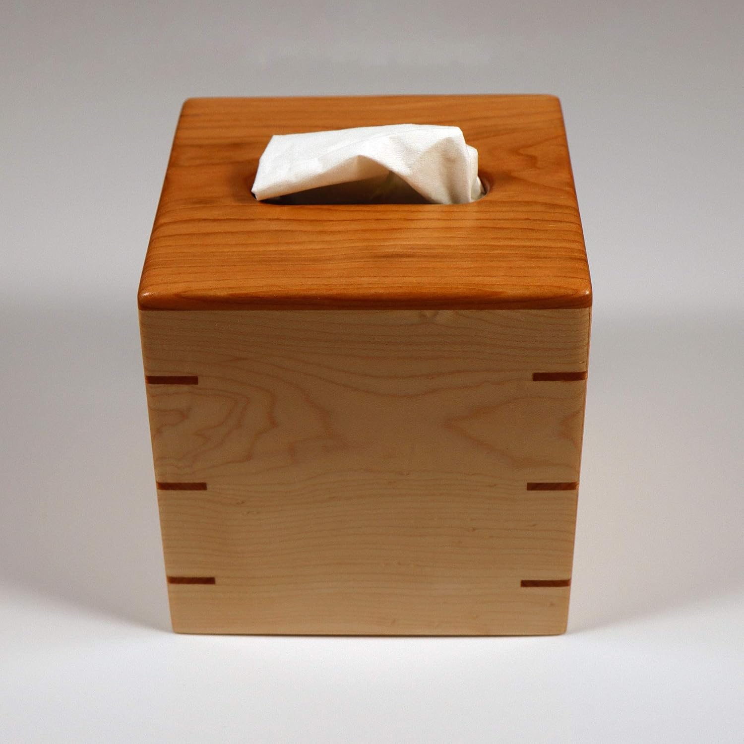 Custom Handmade Tissue Box Cover Holder – Solid Cherrywood/Cherry Top – Solid Maple Sides – Cherrywood/Cherry Splines – Boutique Square Cube Style