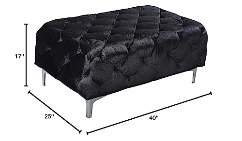 Meridian Furniture Mercer Collection Modern | Contemporary Velvet Upholstered Ottoman with Deep Button Tufting, and Custom Chrome Legs, Black, 40" W x 25" D x 17" H