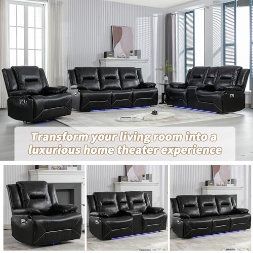Merax Home Theater Recliner Manual Chair Two Built-in Cup Holders for Living Room, Bedroom, 3 Seater+360° Swivel+LED Light Strip, Grey
