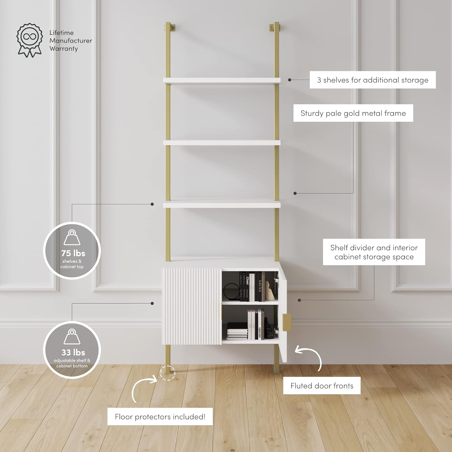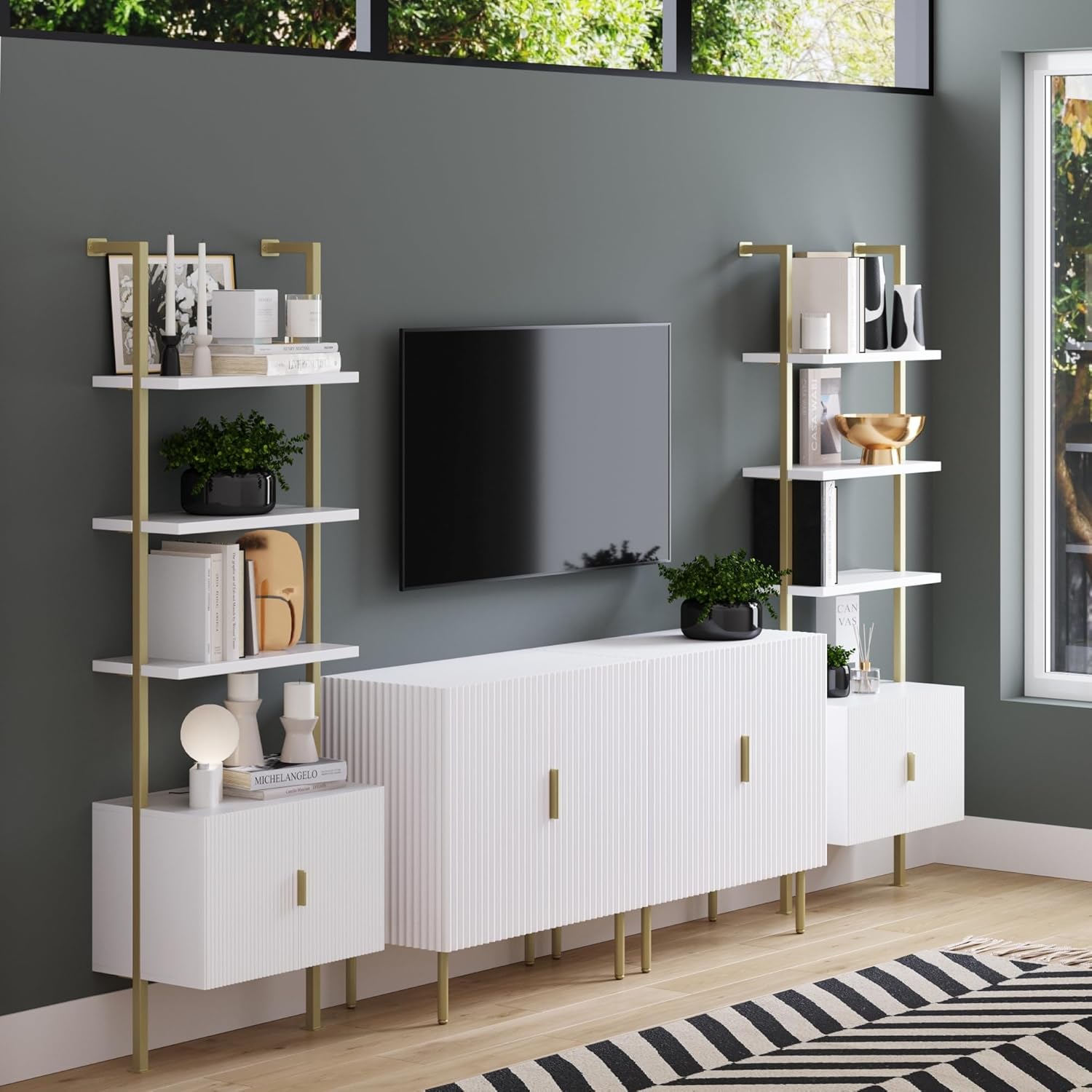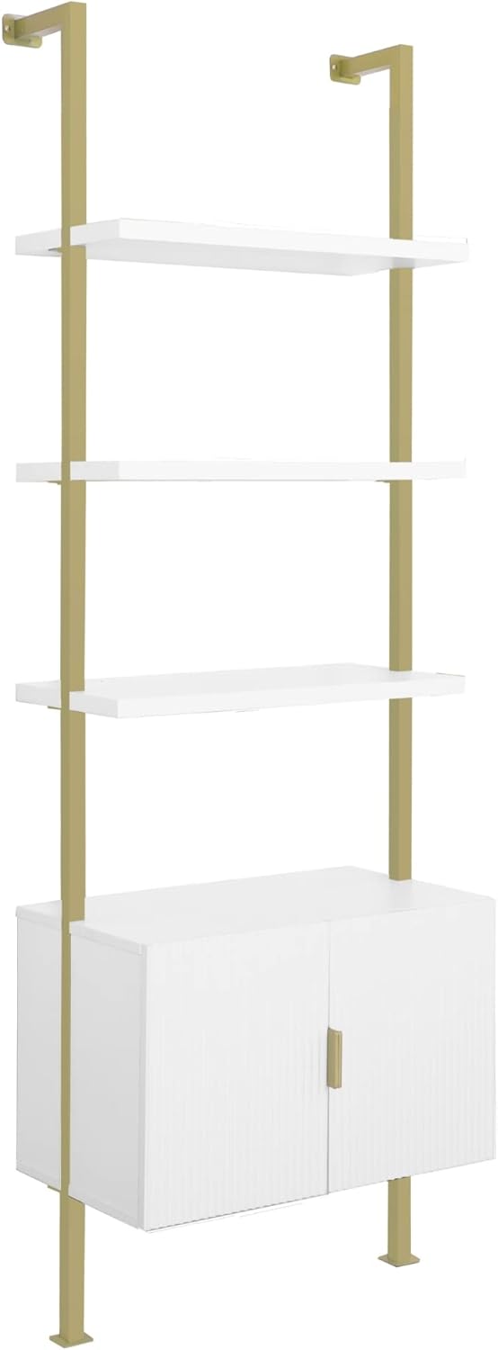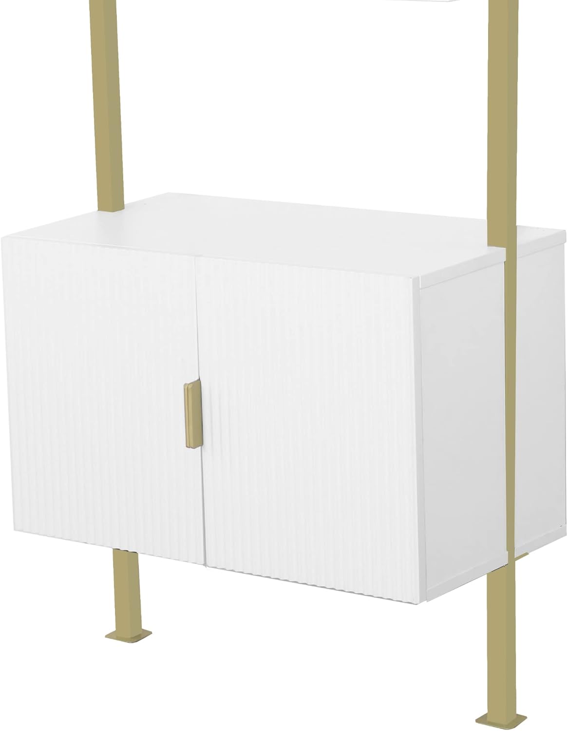 Nathan James Theo Mid-Century Modern Bookcase with Cabinet Fluted Texture, White Open Shelves and Brass Metal Frame Living Room, Home Office Storage, Set of 2
