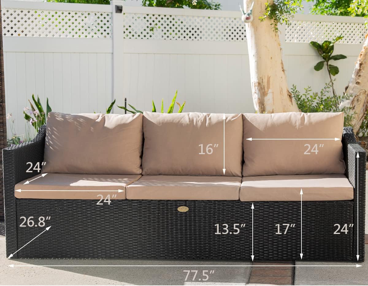 Barton Madison Outdoor Wicker 3-Person Sofa Patio Rattan 3 Seater Sofa Chair W/Cushions, Additional Seats for Sectional Sofa, Porch and Poolside, Black/Beige