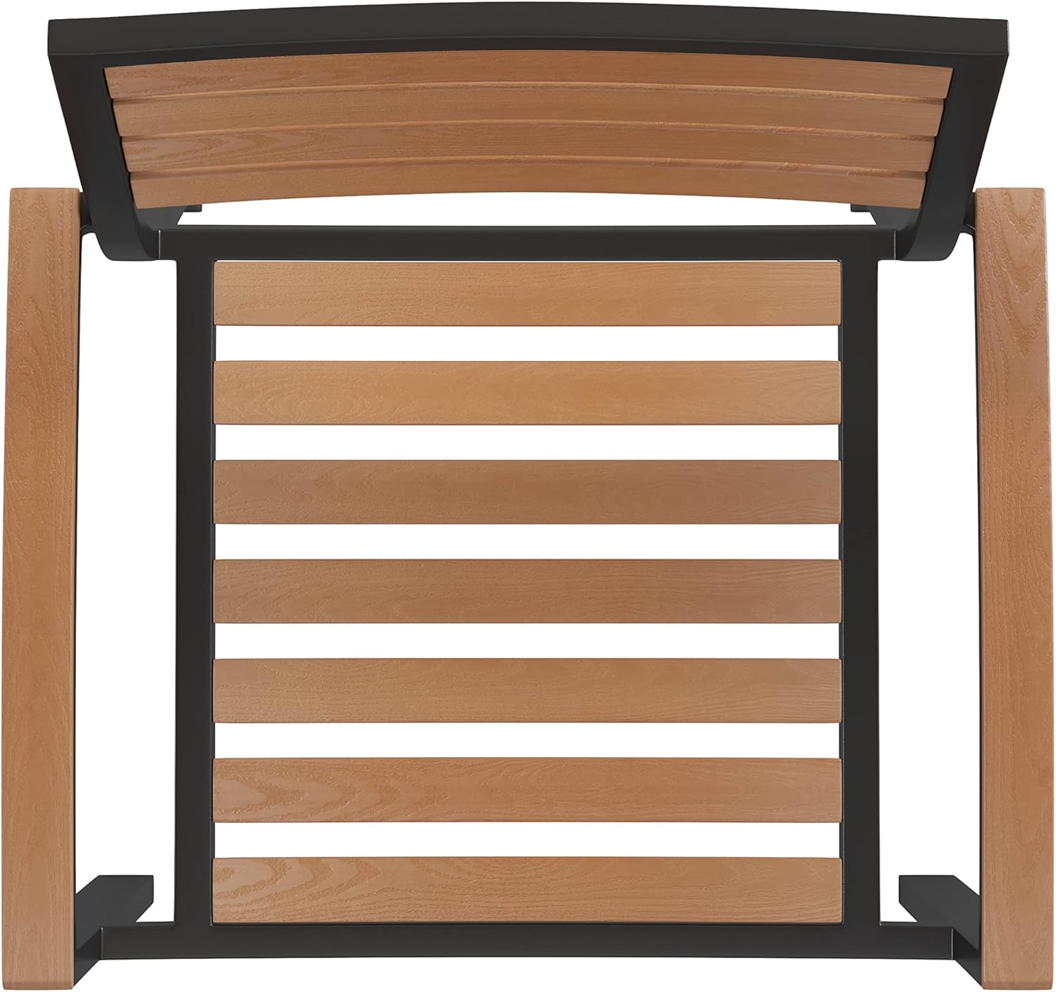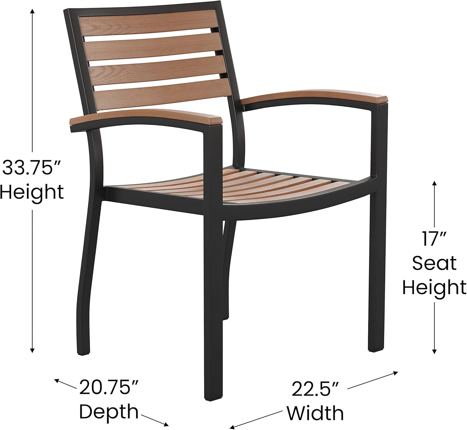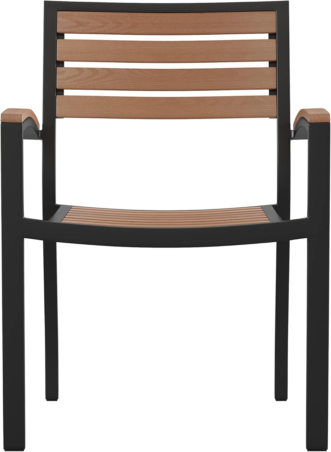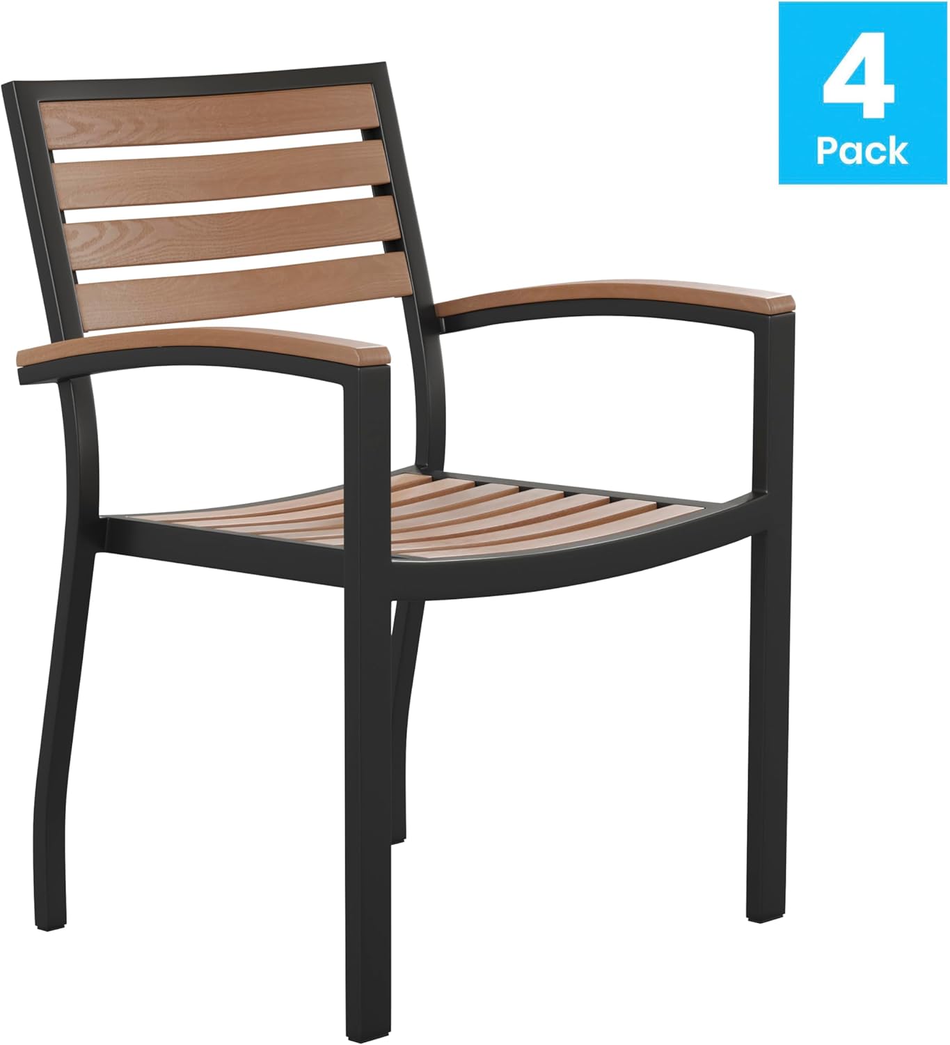 BizChair Stackable Aluminum Patio Chair - All-Weather Black Framed Side Chair with Faux Teak Slats - Commercial Grade - Set of 4