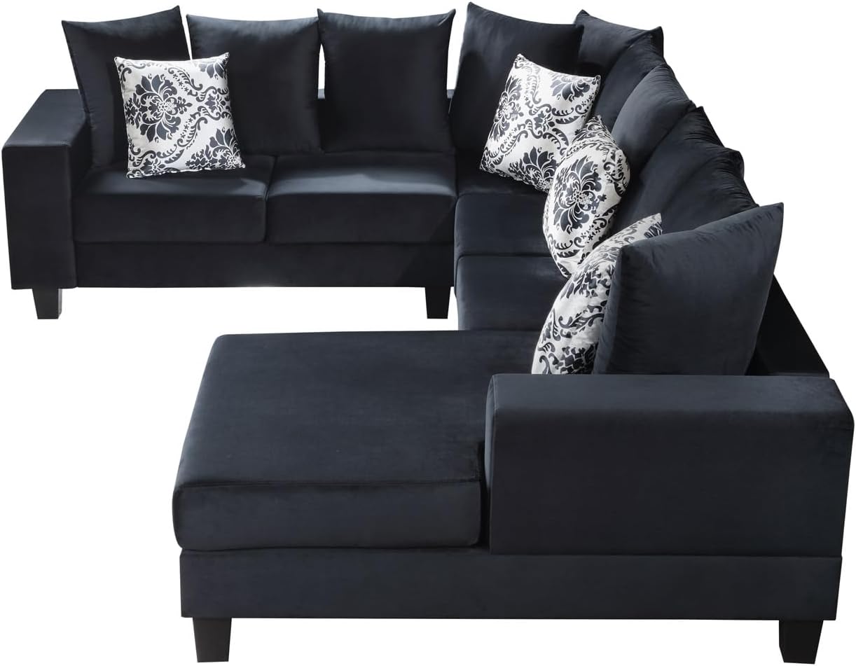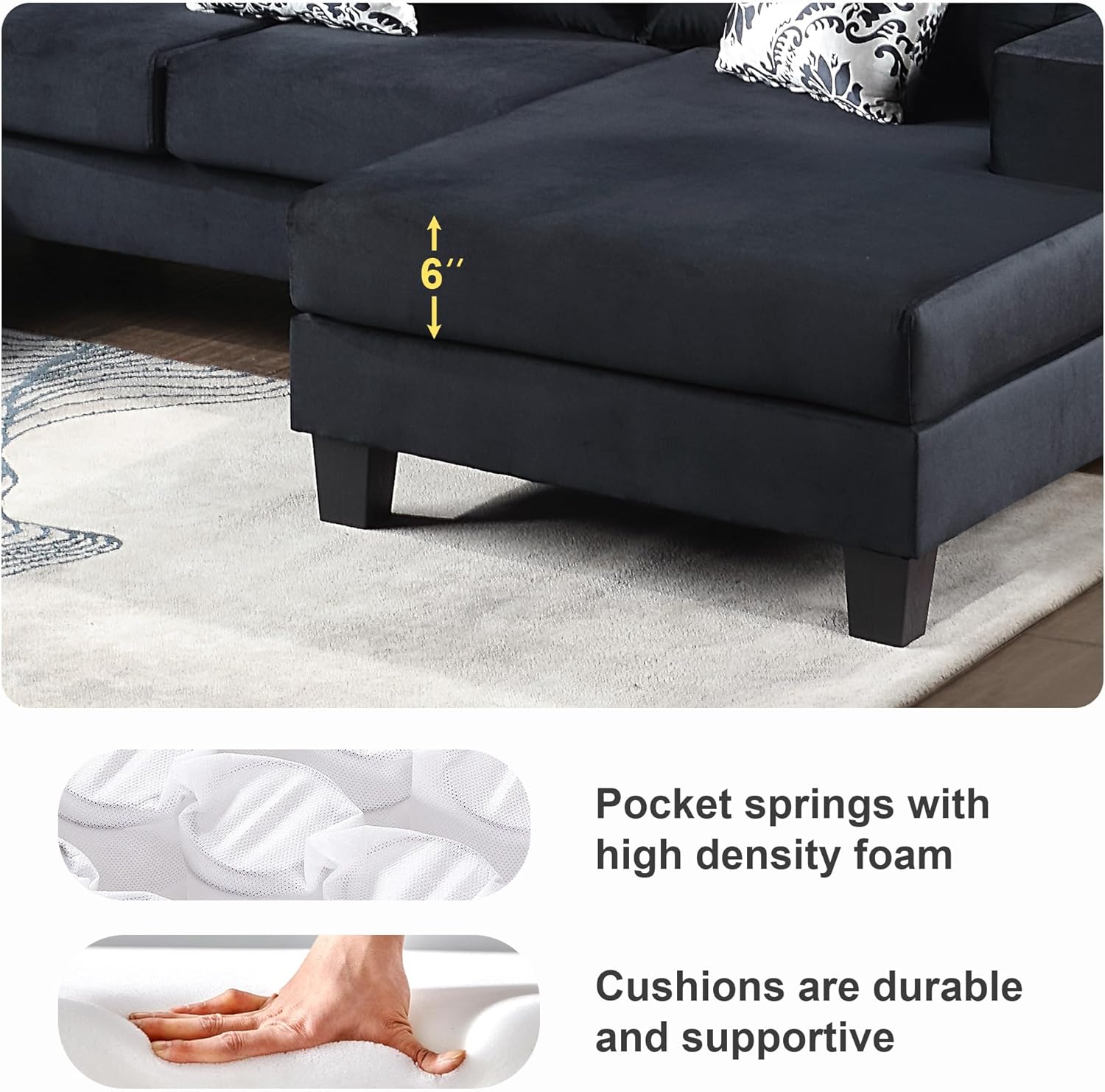 110" Velvet Sectional Sofa, Modern U Shape Corner Couch with Pillows, 7 Seater Sofa Couch Furniture for Living Room, Apartment, Office, Black